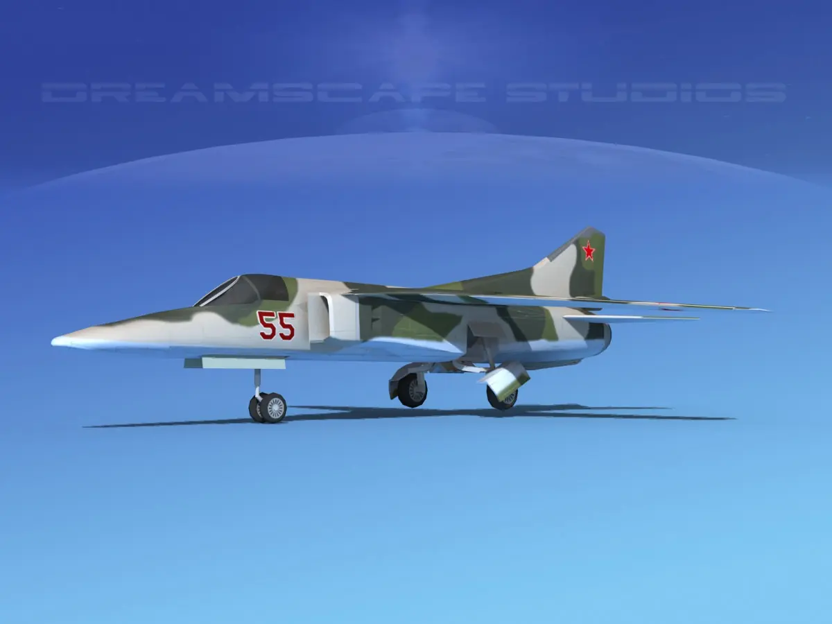 This low poly MIG-27 3d model was built near to scale in general dimensional terms. It includes landing gear and wings are in the most forward sweep position. This model has animateable flaps, slats, stabilizers and rudder. Landing gear can be rotated hidden and landing gear bay doors closed. This model comes with the materials and textures and is available in a wide range of formats.
