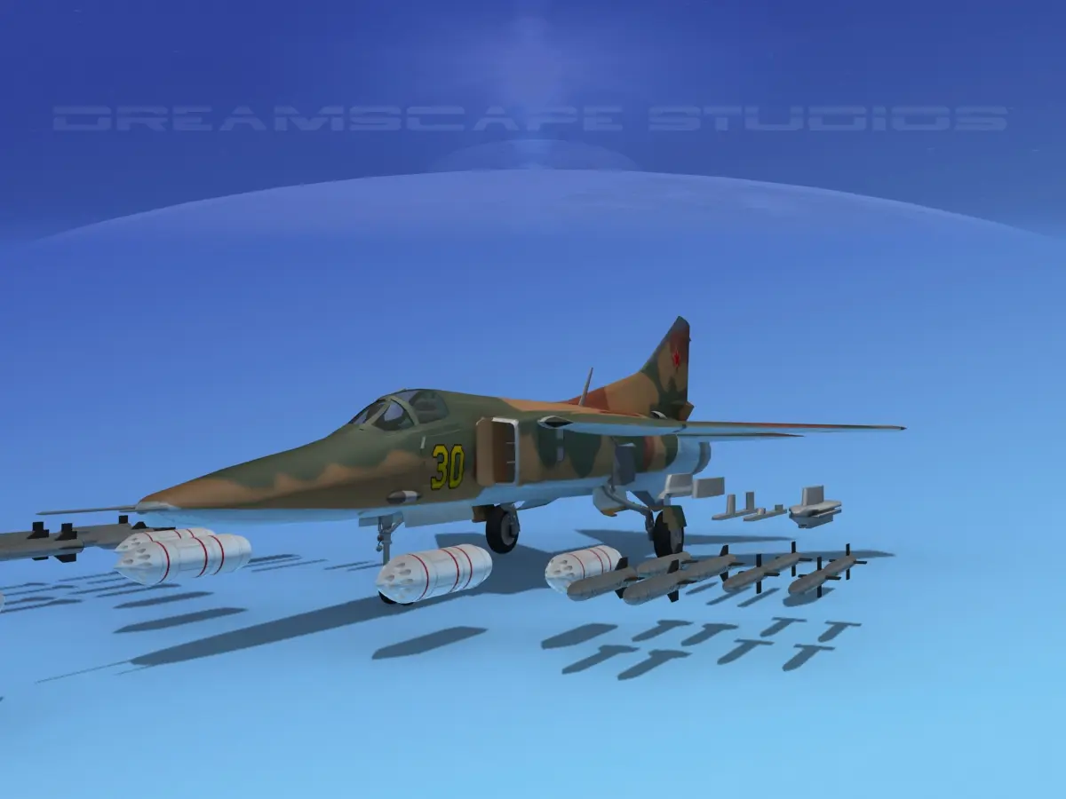 MIG-27 3d model was built very near to scale and it has a very detailed exterior, engine exhaust and after burner section as well as cockpit. It is fully textured including flight instruments and engine exhaust components. In has many animateable features including variable sweep or geometry wings, flaps, flaperons, stabilizers, rudder, wheels, landing gear and landing gear doors, missiles and rockets, opening canopy, throttle and stick, toggle switches and others. It has high quality maps and materials and is available in a wide range of formats. It also comes with a weapons collection and pylons for your addition to the aircraft.