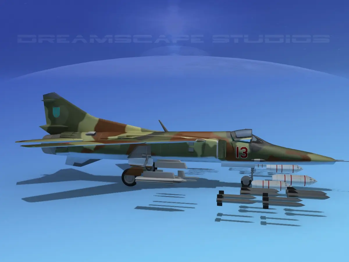 MIG-27 3d model was built very near to scale and it has a very detailed exterior, engine exhaust and after burner section as well as cockpit. It is fully textured including flight instruments and engine exhaust components. In has many animateable features including variable sweep or geometry wings, flaps, flaperons, stabilizers, rudder, wheels, landing gear and landing gear doors, missiles and rockets, opening canopy, throttle and stick, toggle switches and others. It has high quality maps and materials and is available in a wide range of formats. It also comes with a weapons collection and pylons for your addition to the aircraft.