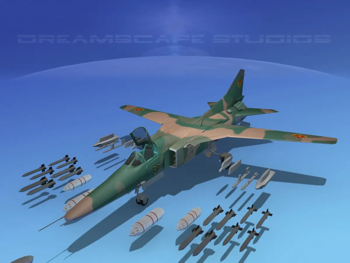 MIG-27 3d model was built very near to scale and it has a very detailed exterior, engine exhaust and after burner section as well as cockpit. It is fully textured including flight instruments and engine exhaust components. In has many animateable features including variable sweep or geometry wings, flaps, flaperons, stabilizers, rudder, wheels, landing gear and landing gear doors, missiles and rockets, opening canopy, throttle and stick, toggle switches and others. It has high quality maps and materials and is available in a wide range of formats. It also comes with a weapons collection and pylons for your addition to the aircraft.