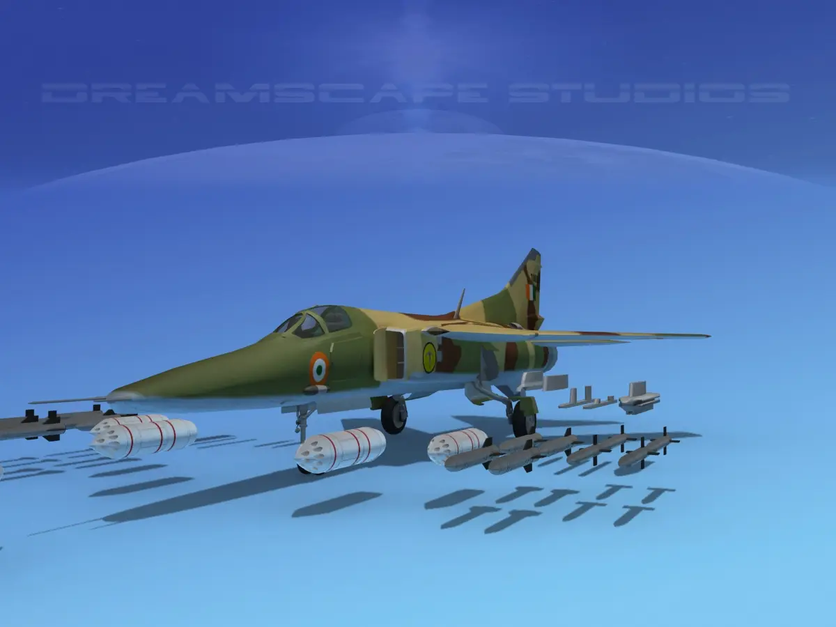 MIG-27 3d model was built very near to scale and it has a very detailed exterior, engine exhaust and after burner section as well as cockpit. It is fully textured including flight instruments and engine exhaust components. In has many animateable features including variable sweep or geometry wings, flaps, flaperons, stabilizers, rudder, wheels, landing gear and landing gear doors, missiles and rockets, opening canopy, throttle and stick, toggle switches and others. It has high quality maps and materials and is available in a wide range of formats. It also comes with a weapons collection and pylons for your addition to the aircraft.