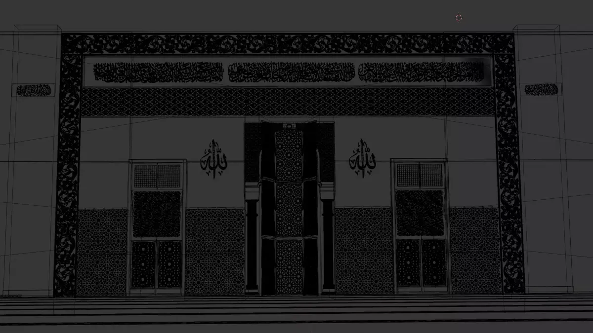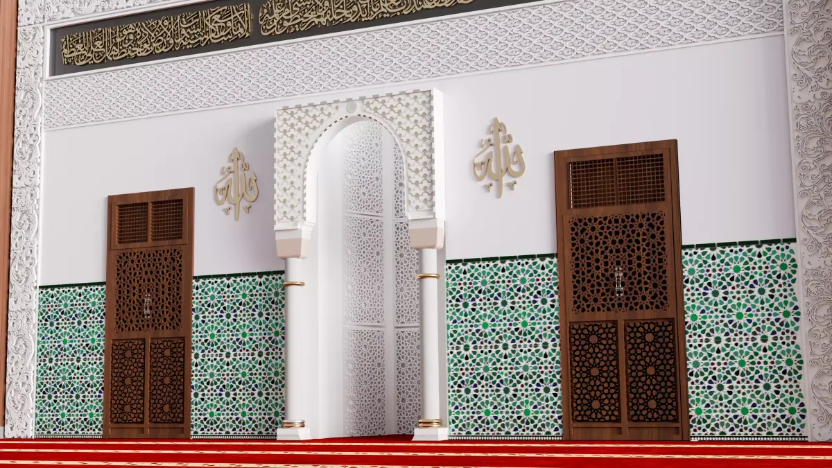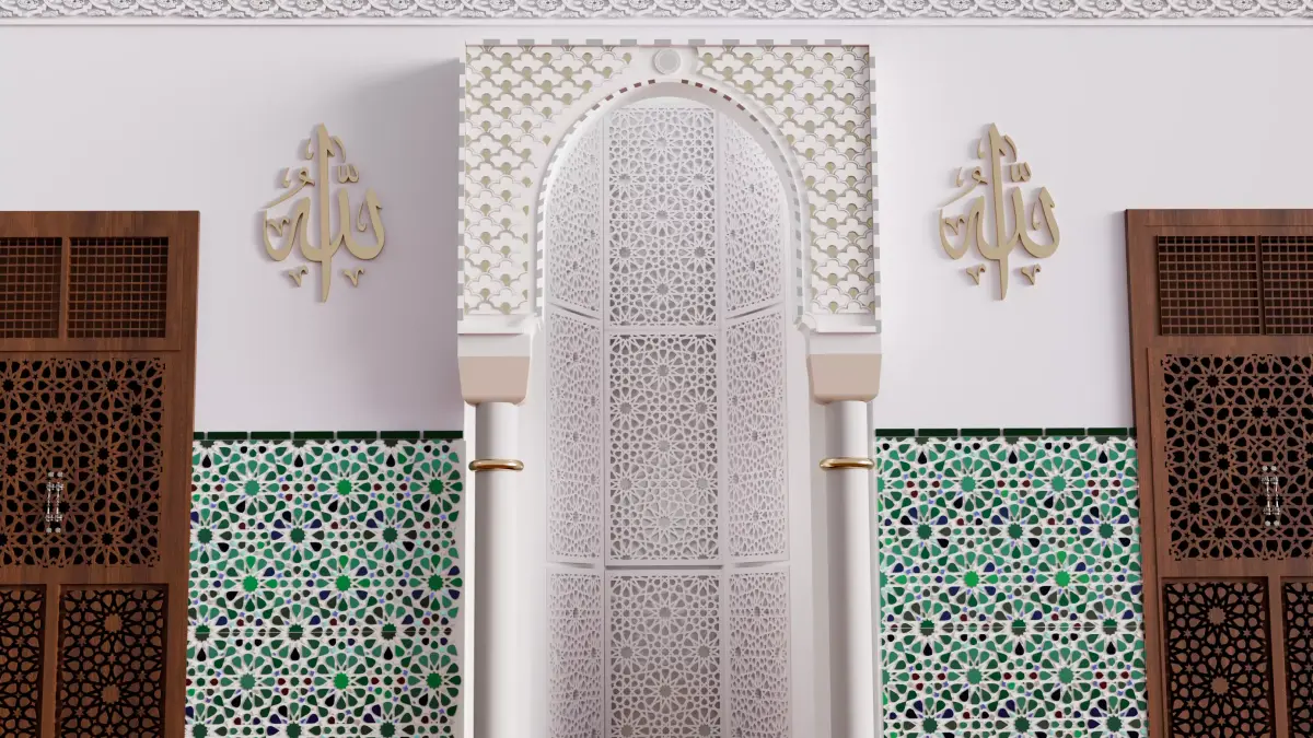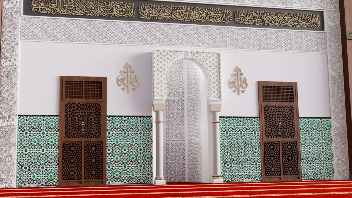 Realistic 3D model of an Islamic mihrab inspired by traditional Moroccan / Andalusian architecture.It features detailed geometric patterns (zellige tiles), carved panels, decorative wooden doors, and elegant wall calligraphy.