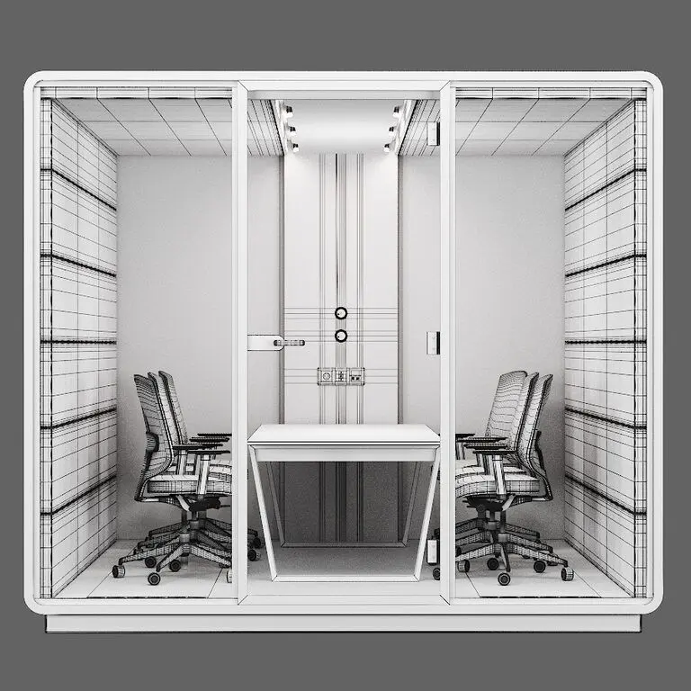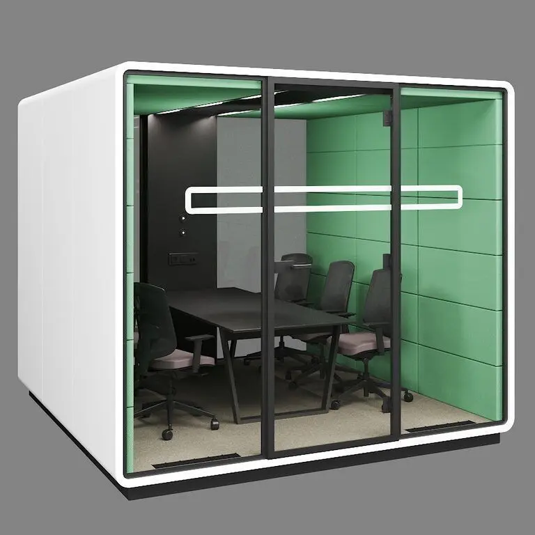 The Hush collection of acoustic booths was designed to challenge the traditional work environment and unleash its potential, to create an environment that meets your individual needs.A strategic venue for important meetings, used by a small conference room.