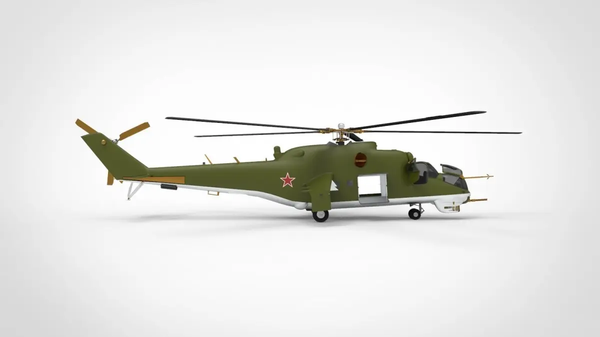The Mil Mi-24 Hind is an iconic and heavily armed helicopter known for its distinctive appearance and formidable capabilities. Developed by the Soviet Union's Mil Design Bureau, the Mi-24 Hind serves as a heavily armored and armed attack helicopter capable of engaging targets on the ground and in the air. Its sleek and aggressive design features a tandem cockpit arrangement for the pilot and co-pilot/gunner, providing excellent visibility and efficient coordination. The Hind is equipped with powerful turboshaft engines, enabling it to carry a significant payload, including guided missiles, rockets, and cannons. With its versatile weapons systems and advanced avionics, the Mi-24 can effectively engage enemy forces, conduct close air support, and provide aerial reconnaissance in a combat environment. The helicopter's robust construction and heavy armor protection offer enhanced survivability in hostile situations. The Mil Mi-24 Hind has been widely exported and utilized by various nations around the world, solidifying its reputation as a fearsome and reliable combat helicopter.