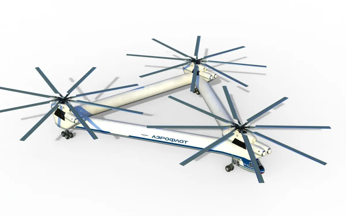 A project of the heavy flying crane helicopter with a take-off weight of 140 tons intended for transporting civil and military technics. Not built.Calculated takeoff mass of the Mi-32, depending on the assumed application of a helicopter, were about 136-146 tons, the static ceiling - 1000-1500 m, service ceiling 4000 m, speeds- 200-230 km/h, ranges from 300 to 1200 km.In 1982 specialists at Mil, in accordance with the government task, prepared the project of the decision by the CC CPSU and the Council of Ministers of USSR about the creation Mi-32. According to the estimations of the workers at Mil, toward the end decade the country could obtain this unique transportation means. However, decisions to do so did not follow.