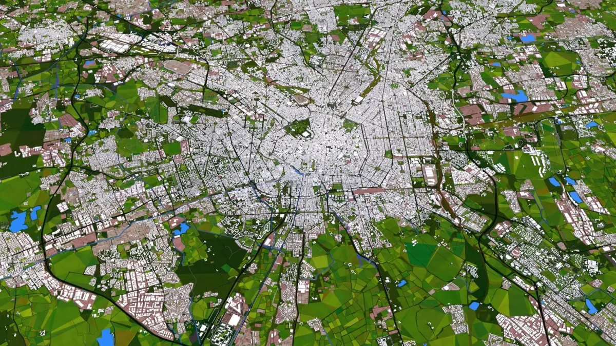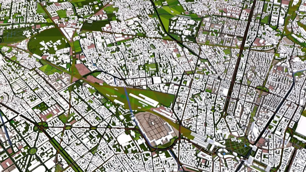 For other 3d applications there are different formats included such as FBX (with materials) , OBJ (with materials) , stl, 3ds, etc. I recommend using OBJ or FBX and import them in your 3d application and reload the textures provided or use your own favourite materials. Replacing the materials is easy because minimum numbers and proper naming. Once loaded you can merge ALEMBIC or DXF file on top of the polygon and can recreate the road, rail, water details or add traffic. Alembic and DXF are 2d files with the curve information only. Check all images before purchasing, if any doubts you can drop a message. You can ask for a specific city also.
