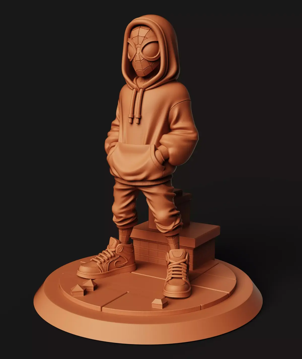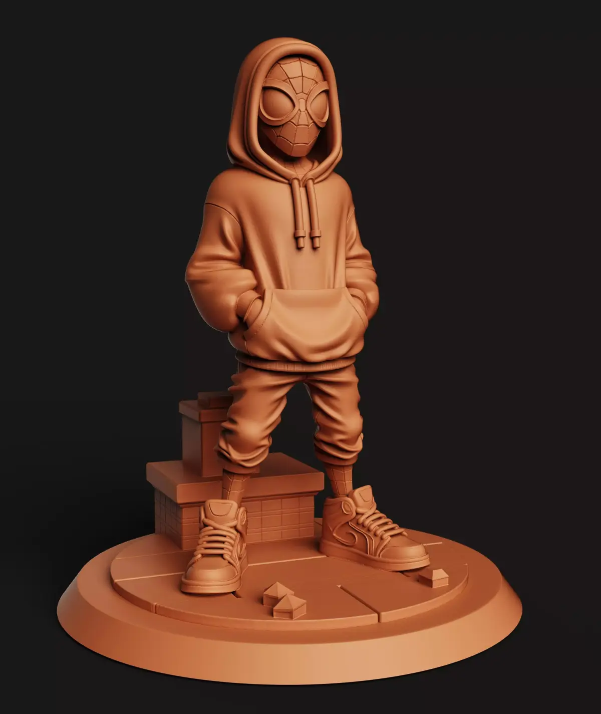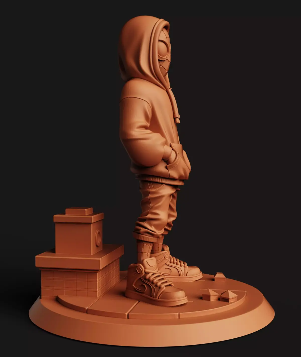 Modern Miles Morales 3D sculpt wearing urban streetwear (hoodie and sneakers). This figure captures the unique vibe of the Into the Spider-Verse movies. Designed with professional-grade textures, making it a premium addition to any superhero collection.