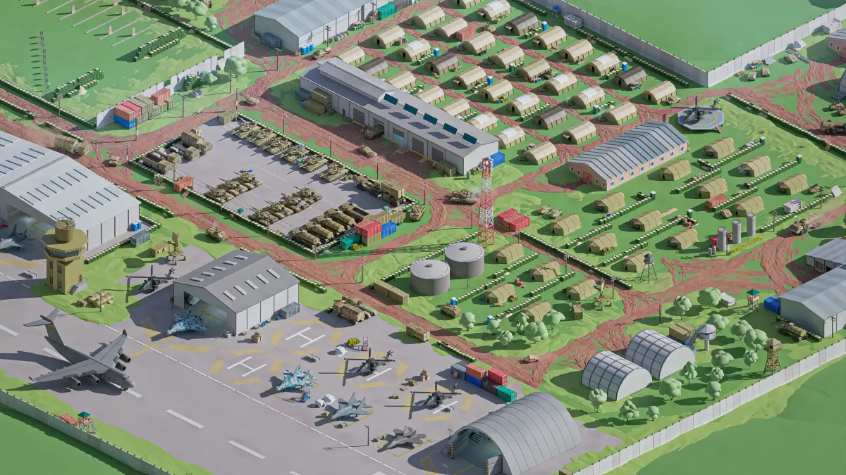 - Buildings (x27): Hangar, garage, barracks, checkpoint, administrative building, guard tower, command and control center, communication tower, storage tank, water tower, command post, etc.