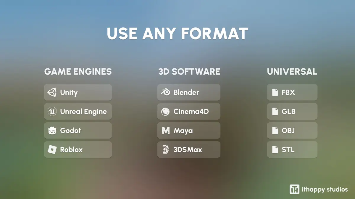 FILESYou’ll be able to download formats such as Unity Package, UE, Blender, C4D, Maya, 3DSMax, FBX, OBJ, GLTF, and STL.