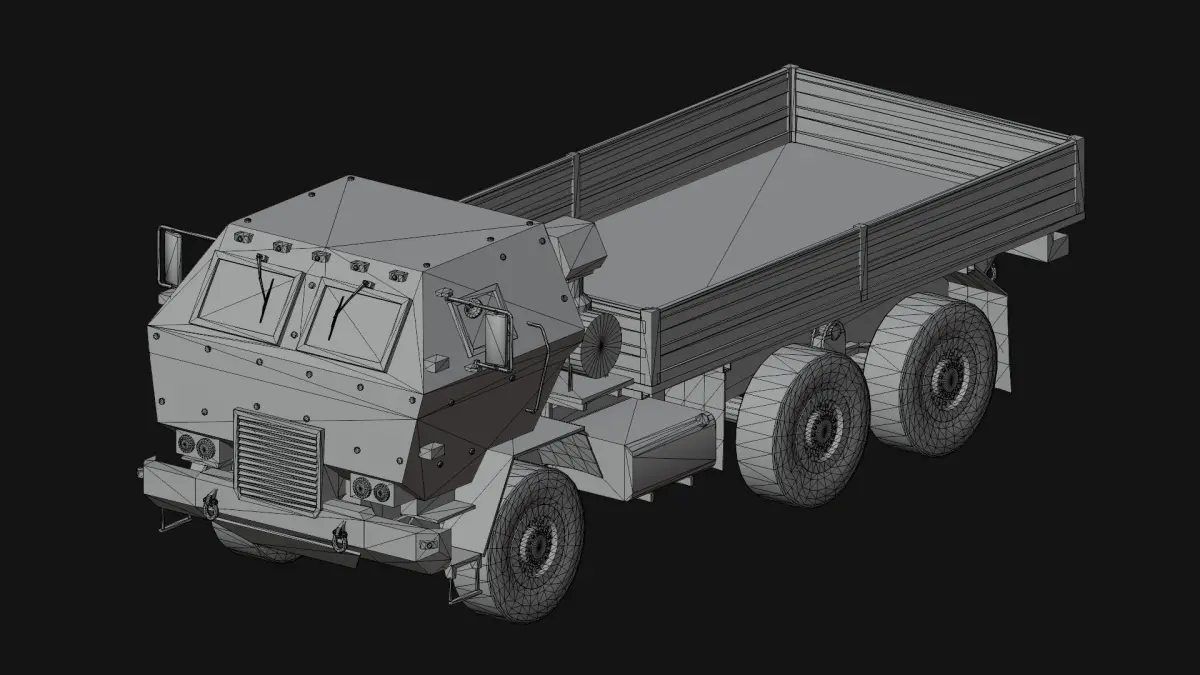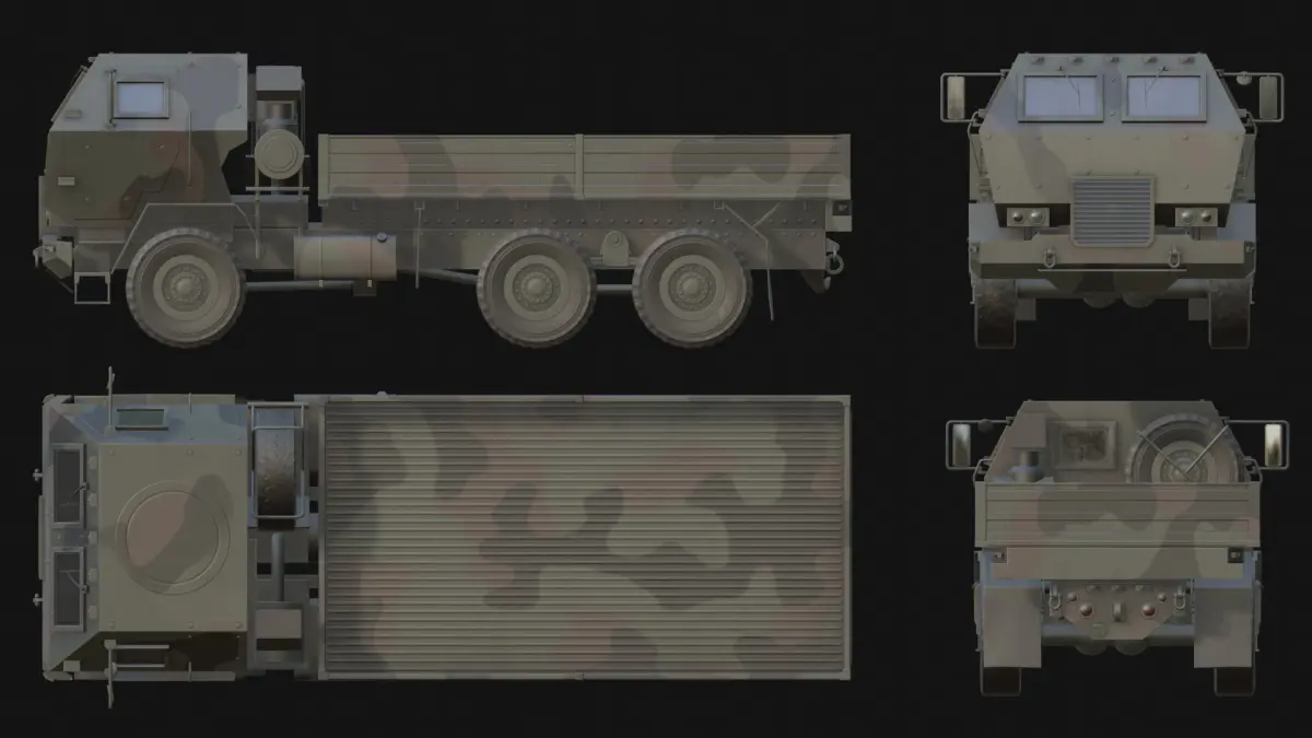PBR metallic roughness textures in .png format. 4096px for the cabin, frame and cargo bed. 1024px for the wheel. Two texture variants: desert and woodland.