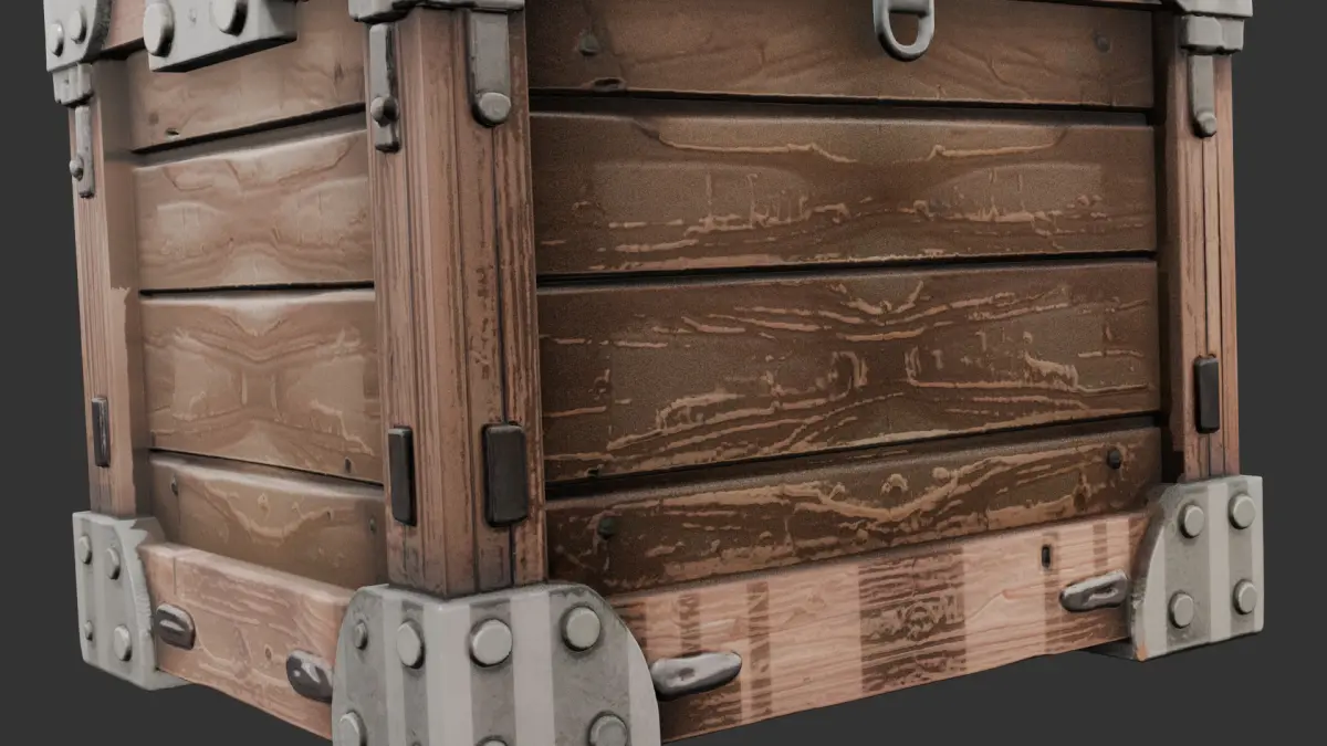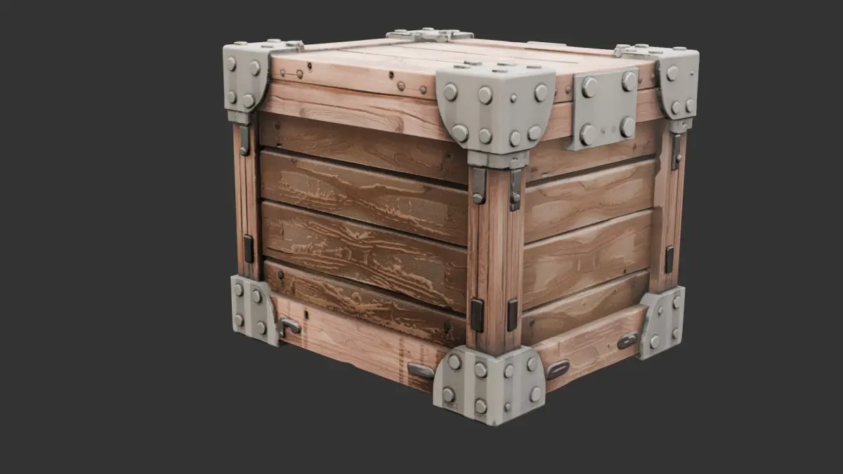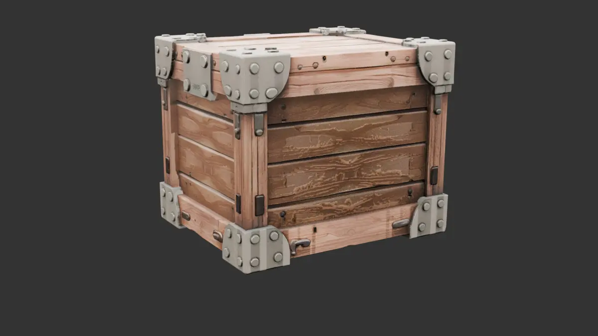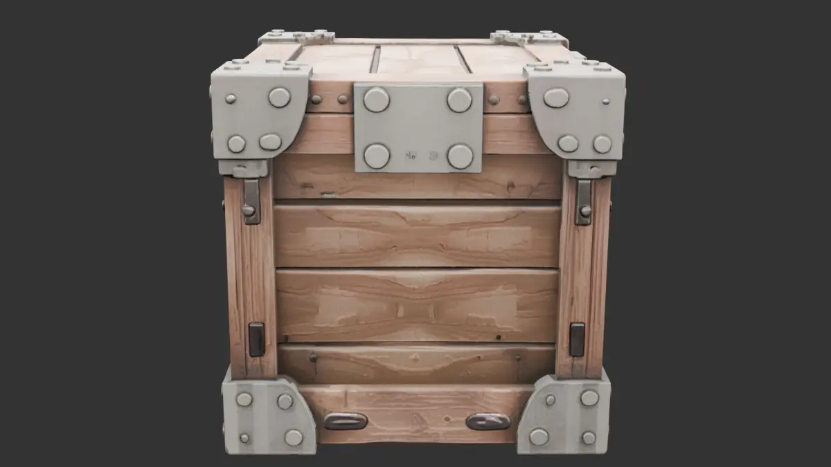 A realistic wooden ammo crate reinforced with metal corners and locking clips. Perfect for military base scenes, shooting ranges, or battlefield supply depots. Includes subtle wear and scratches for added realism.