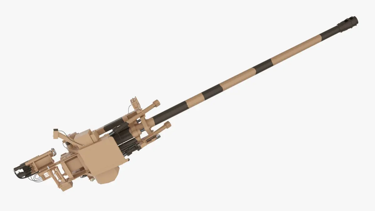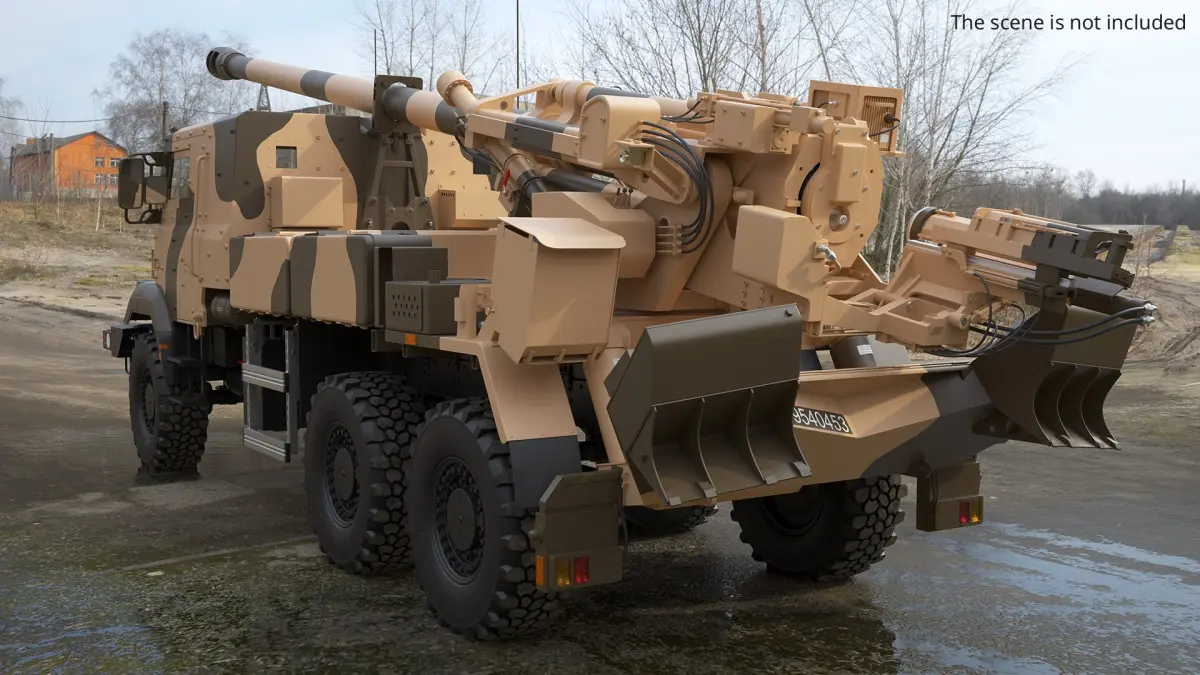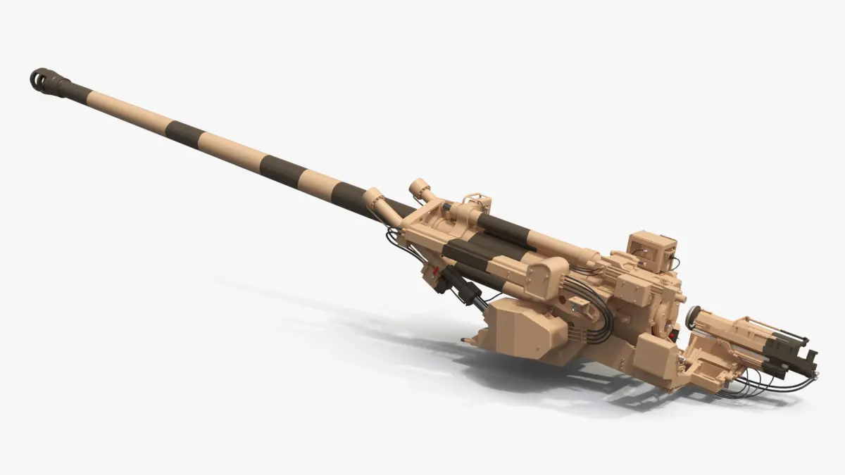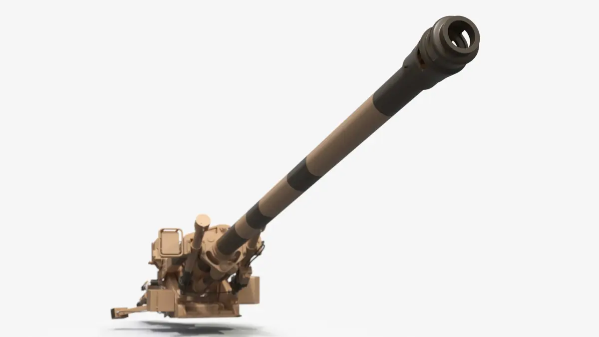 This model highlights the essential structural elements of a modern artillery piece, including its long barrel with muzzle brake, recoil systems, and stabilization components. Its desert camouflage finish reflects deployment in arid and sandy terrains, making it ideal for realistic military visualizations.
