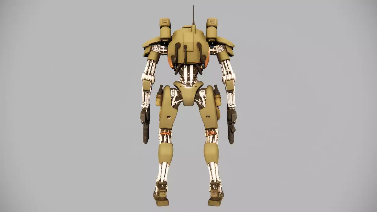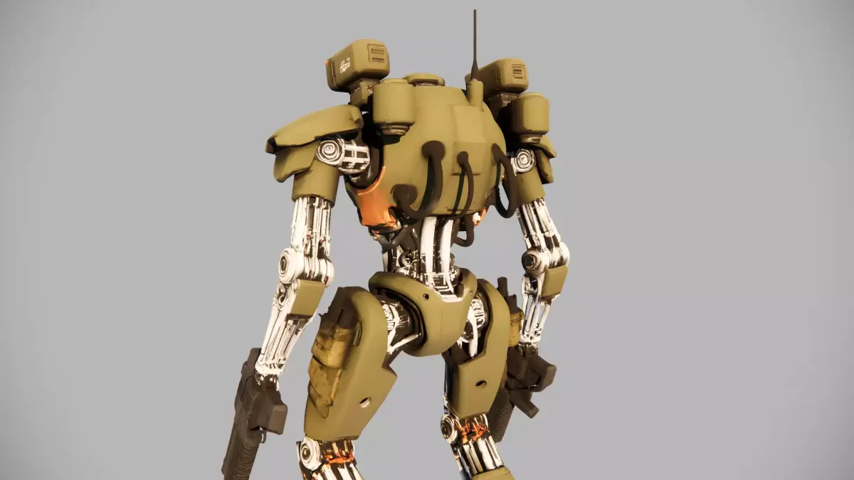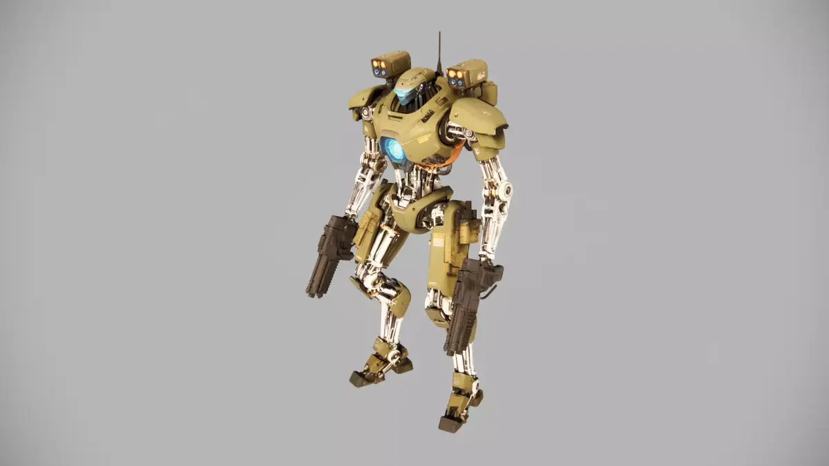 This high-mobility military mech is engineered for frontline operations, featuring reinforced olive-drab alloy plating, a plasma-core energy reactor (visible central blue emitter), and dual integrated ballistic sidearms. Its articulated titanium alloy limbs ensure precision movement in rough terrain, while shoulder-mounted sensor arrays (dual LED modules) enable long-range target acquisition. Designed for both combat and support roles, this unit balances durability, agility, and firepower—ideal for sci-fi wargaming, 3D asset libraries, or concept art projects.