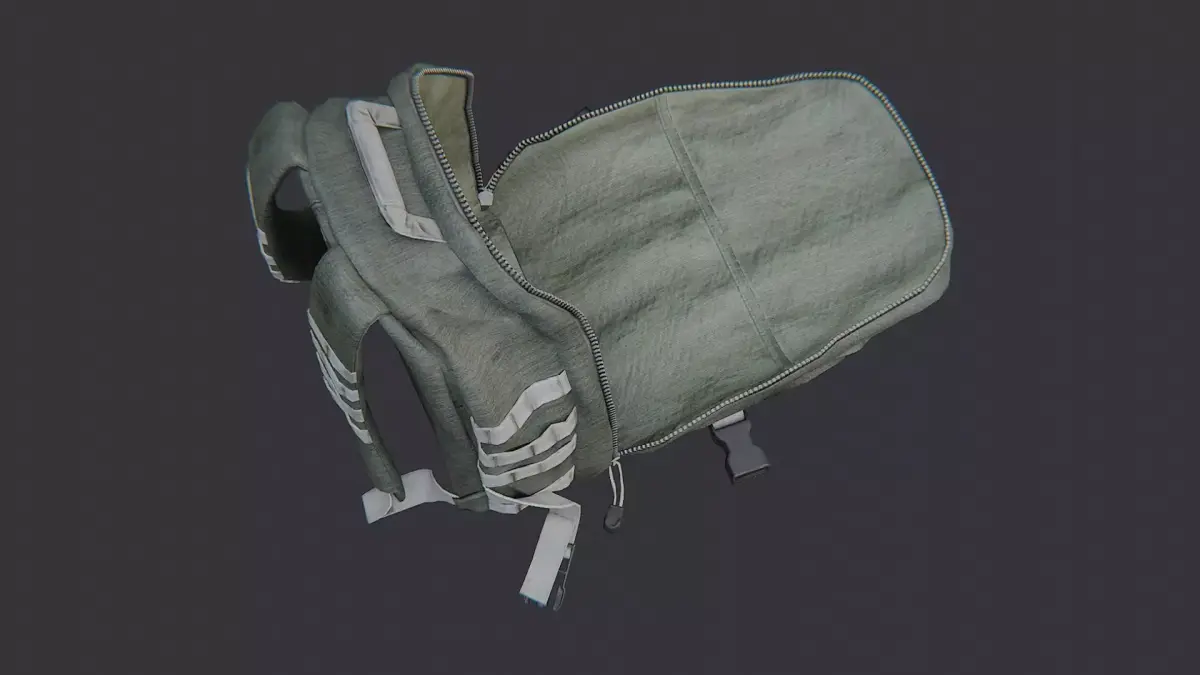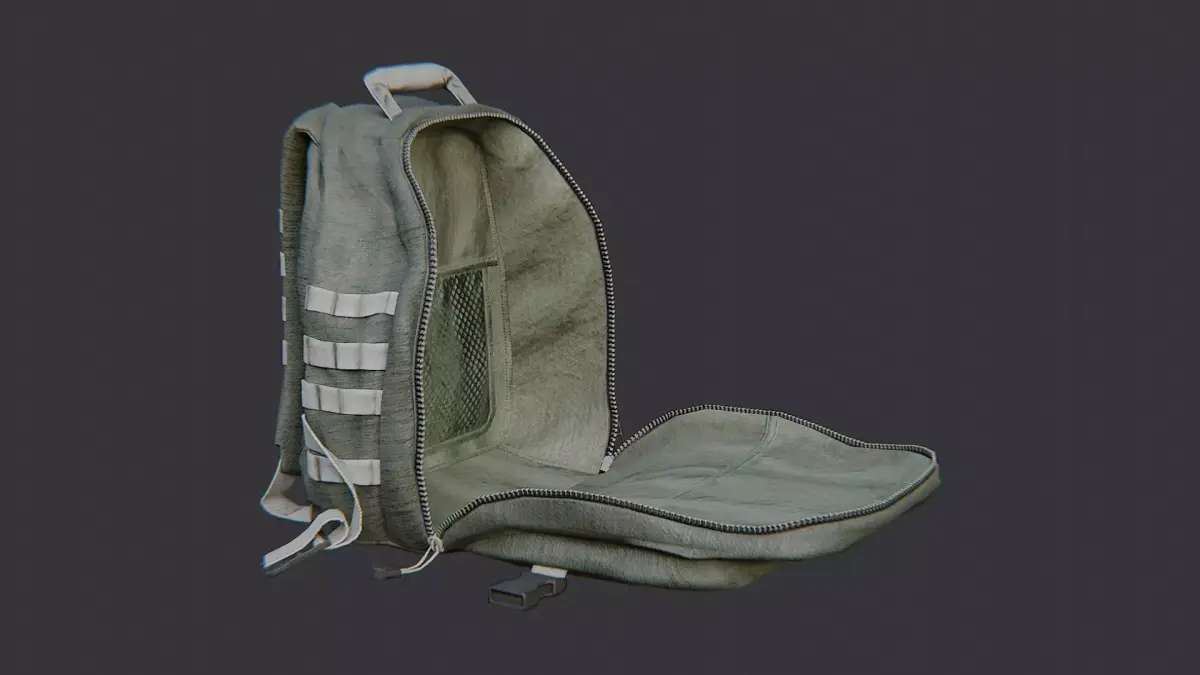 Rugged military backpack with a two tone green fabric. The open main compartment shows a roomy interior with practical pockets for gear. Durable straps and side pockets offer versatile storage for field work, camping, or training displays. This model is ideal for catalogs and renders.