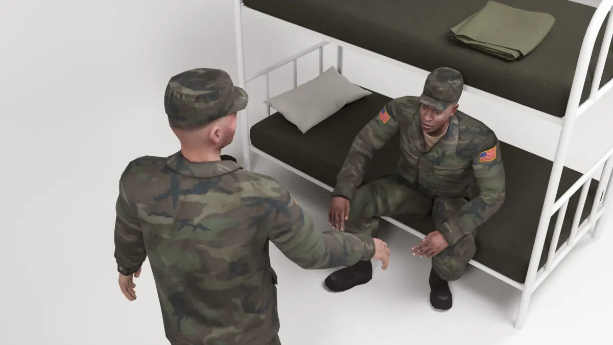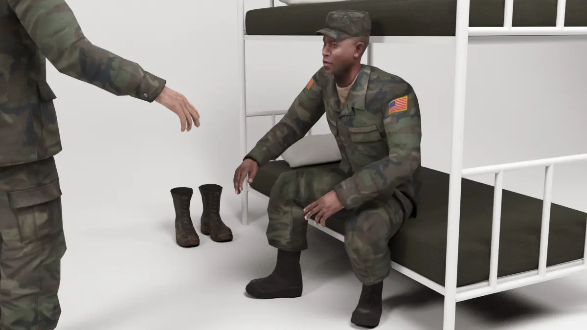 3D models of two American soldiers next to some bunks in a military barrack. It is included: pillows, towels and boots. The human bodies have bones to be able to modify the postures. The models has been created with 3D Studio Max 2022 and Blender 3.3. All the models are low poly, basic but realistic and are ideal for 3D scenes that require few polygons. They can be used for advertising visualitations and also for games or applications. It has been created in different 3D Studio Max versions and also in FBX, OBJ and blend.