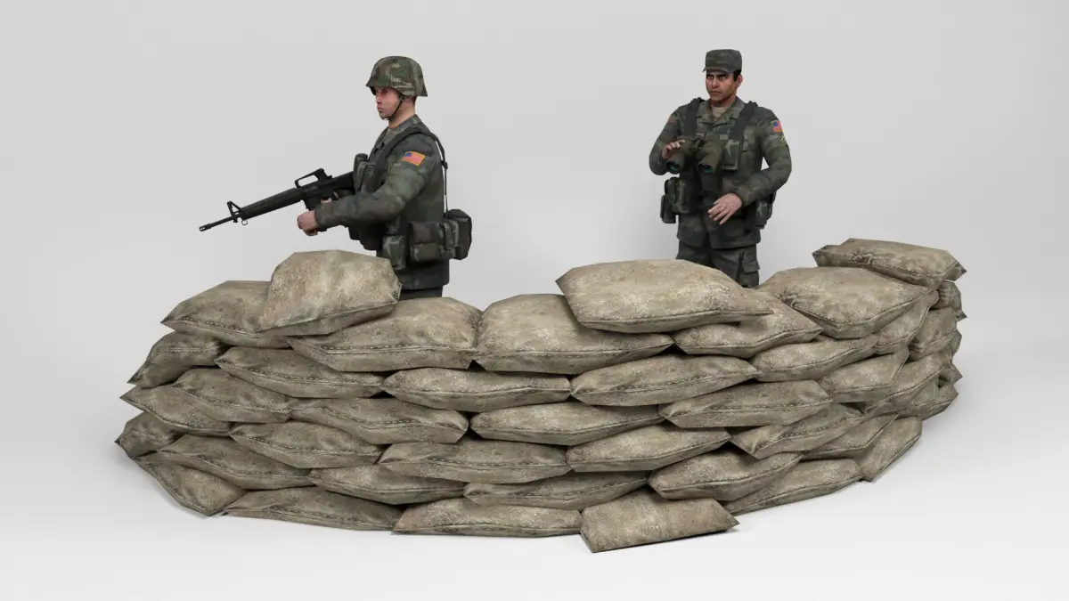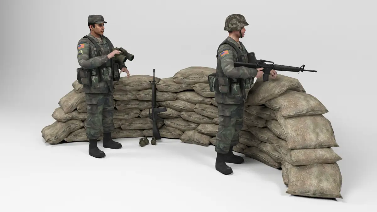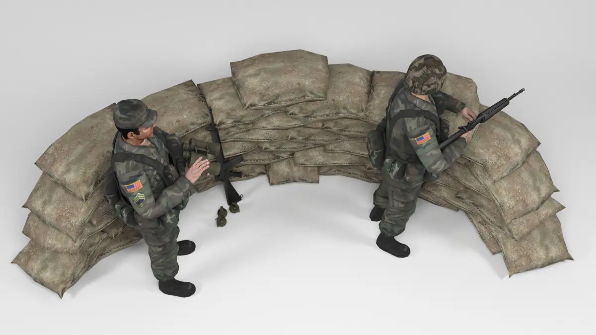 3D models of two American soldiers in a defensive position of sacks. Weapons and binoculars included. The human bodies have bones to be able to modify the postures. The models has been created with 3D Studio Max 2022 and Blender 3.3. All the models are low poly, basic but realistic and are ideal for 3D scenes that require few polygons. They can be used for advertising visualitations and also for games or applications. It has been created in different 3D Studio Max versions and also in FBX, OBJ and blend.