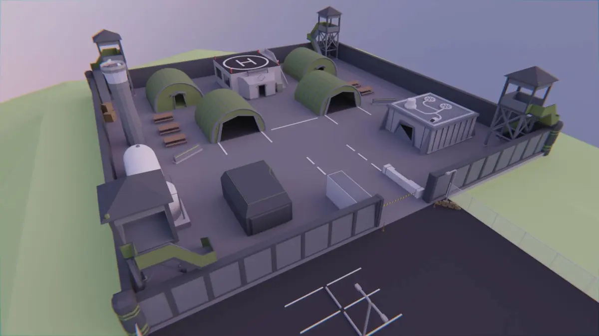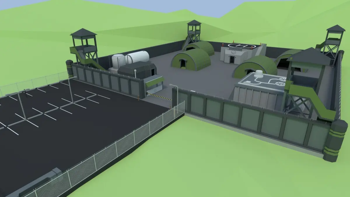 A fully fledged military base with soldier and vehicle barracks, parking lot, weapons locker, watchtowers, comms tower, utilities/electric room, and main office with a heli pad.