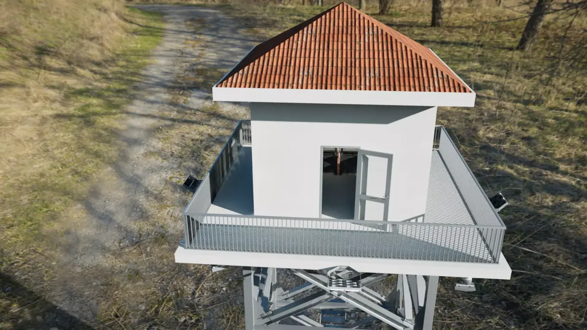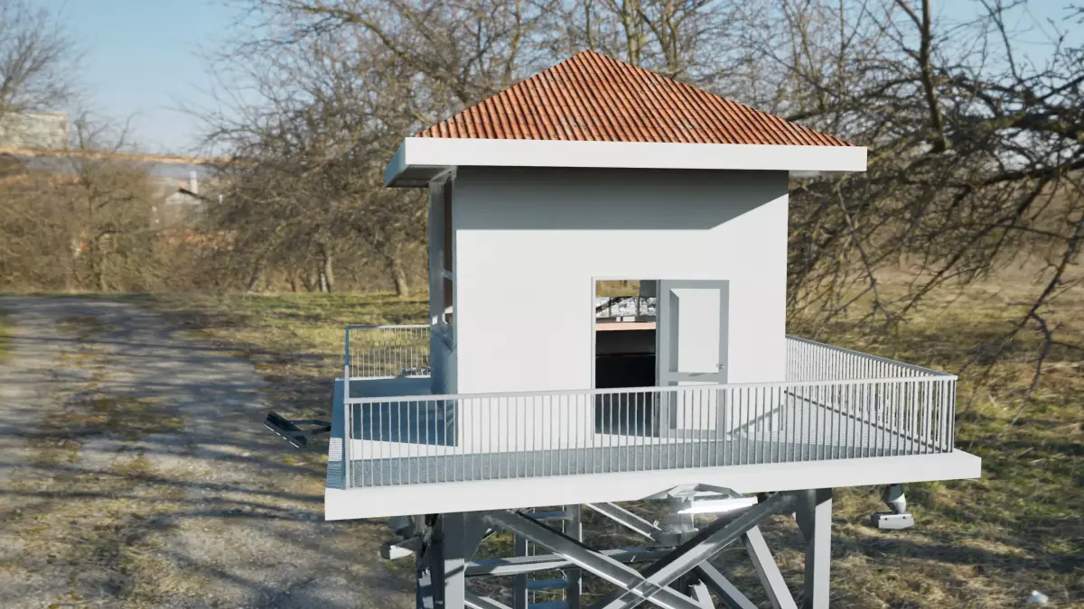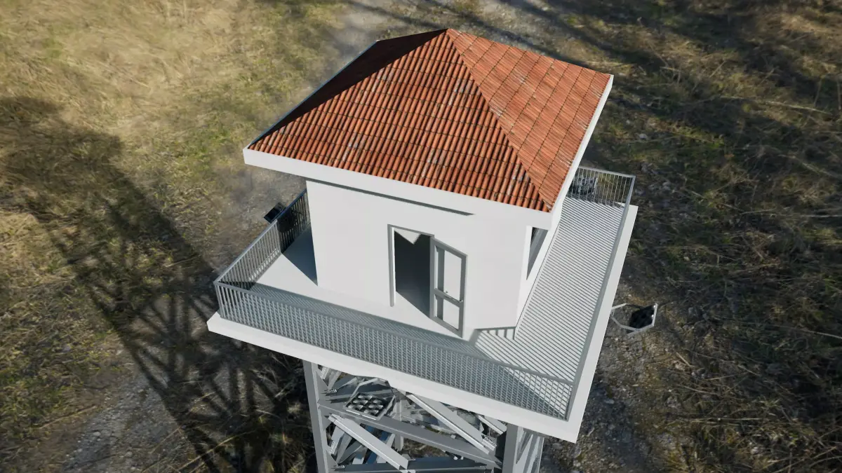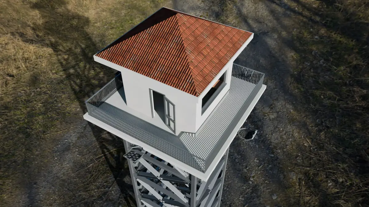 High-quality military base watchtower (mirador / guard tower) designed for realistic environments, architectural visualizations and game-ready scenes.This model includes a steel cross-braced structure, a platform with guardrail, multiple security cameras, LED floodlights, and a top cabin with door and windows.Two roof variations are included: flat roof and tiled roof.