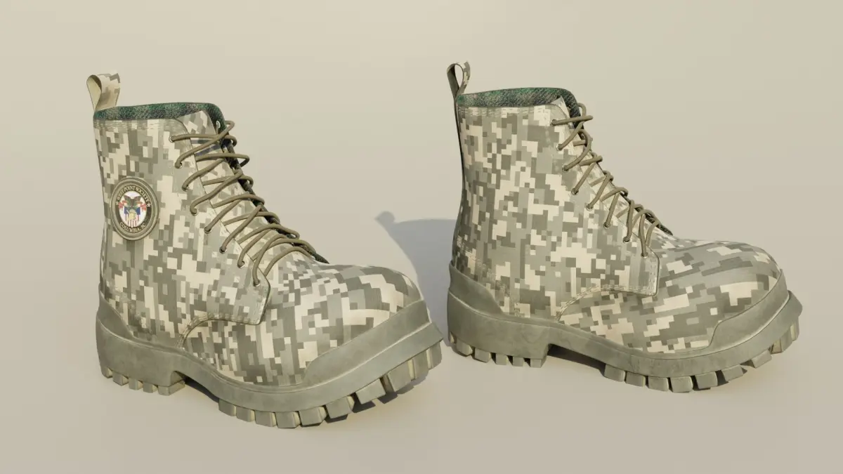 Military boots are modeled in Blender version 3.0. Ideal for adding detail and realism to your rendering projects. Easy to use, just drag the model into your project and start rendering! The image was created using Cycles. PBR materials are used. Materials are prepared for rendering. All textures and materials have a logical name. Texture resolution: 4096x4096 Texture types: Base color, Roughness, Normal (OpenGL), Height, Metallic. Texture format: PNG. File formats: Multi-format OBJ, Multi-format FBX, Blender Format, DAE (Collada). Polygon mesh geometry -273.592 vertices. Polygons 268.718. The model consists of two objects. The model is not triangulated. No overlapping UVs. Model dimensions in metric system - length 26 cm.