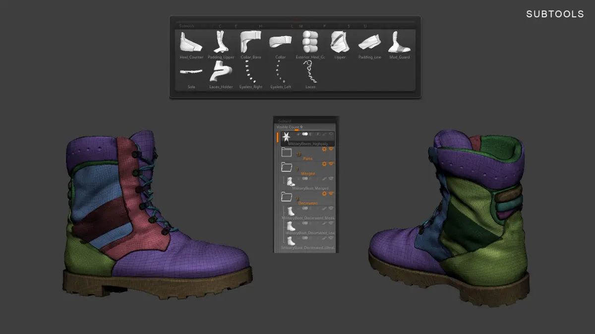 Parts: 13 subtools (The boot divided in parts)Merged: 1 subtool (The boot merged)Decimated: 3 subtools (3 decimated levels of the merged boot)