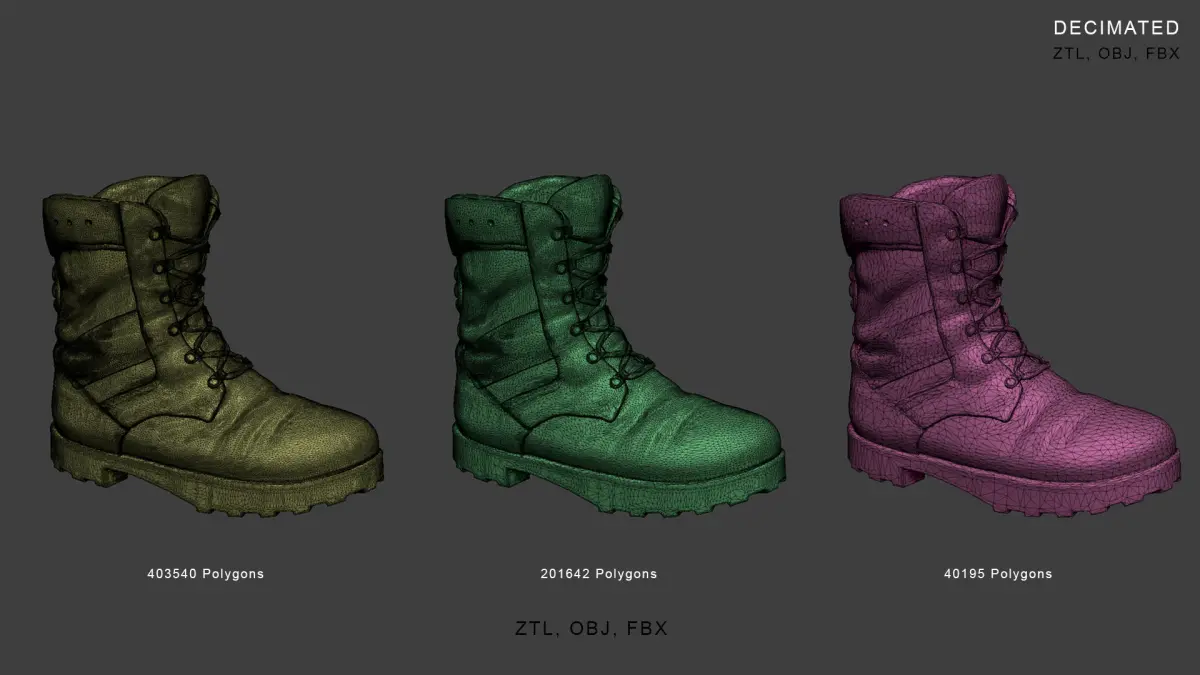 Decimated Meshes: MilitaryBoot_Decimated_Medium: 403,540 Polygons MilitaryBoot_Decimated_Low: 201,642 Polygons MilitaryBoot_Decimated_UltraLow: 40,195 Polygons