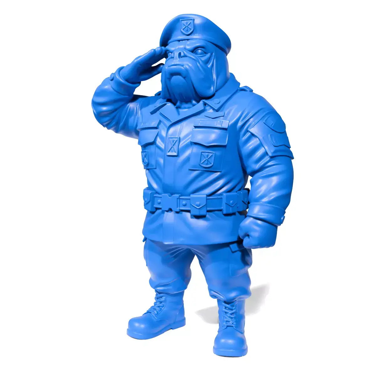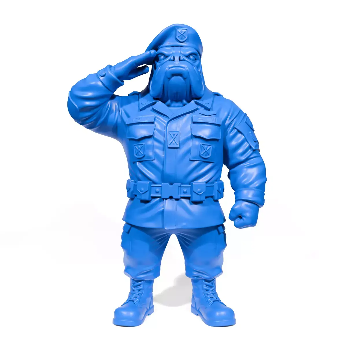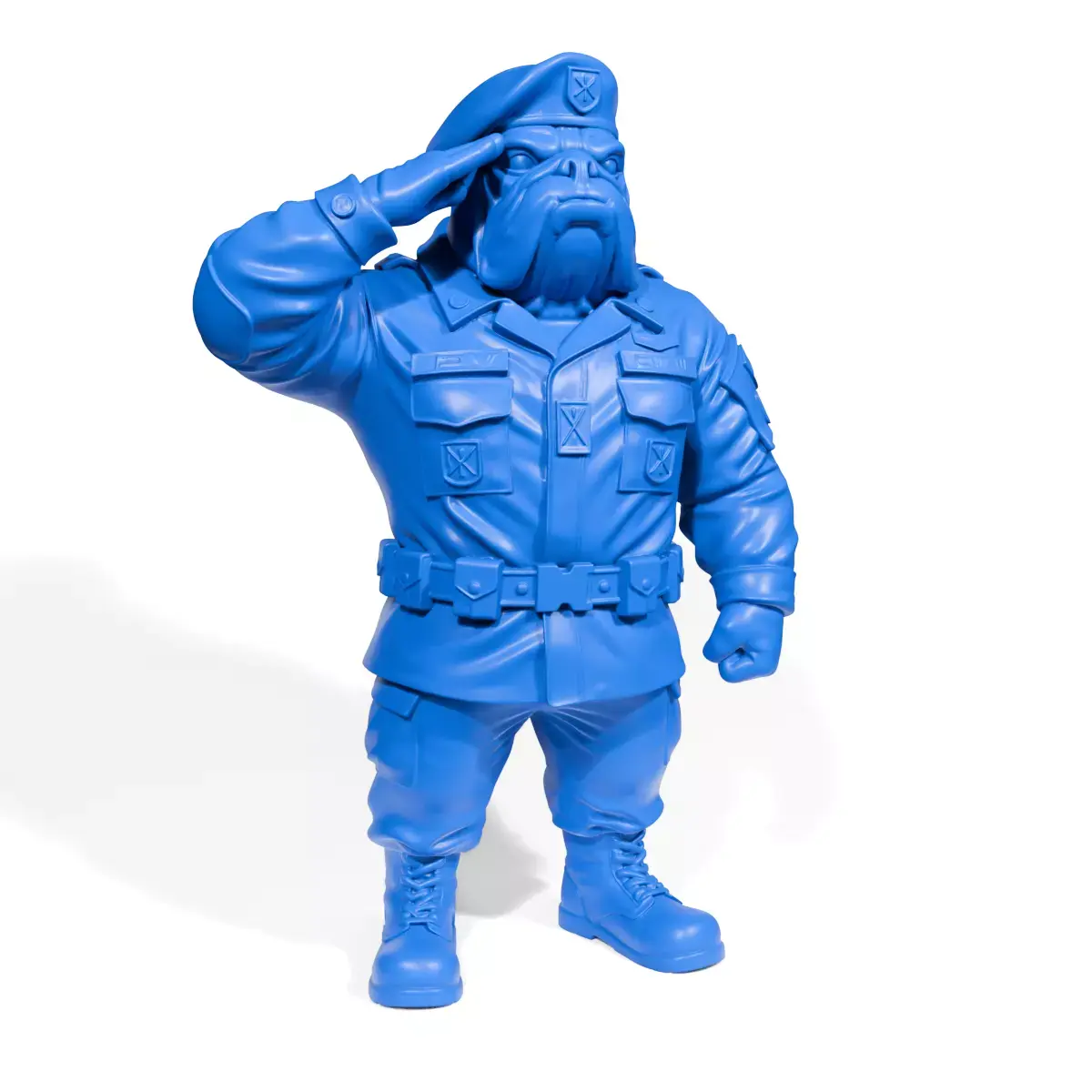 The Military Bulldog 3D model is designed with a unique blend of strength and discipline, represented through a bulldog wearing a military uniform. This symbolizes courage and readiness, captivating with its bold stance and saluting gesture.