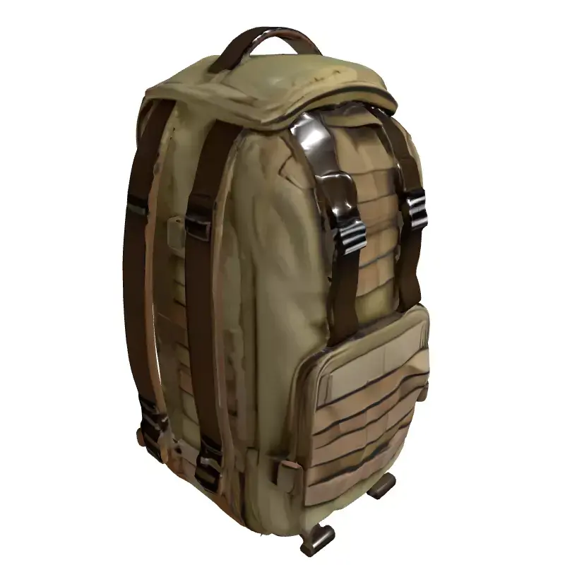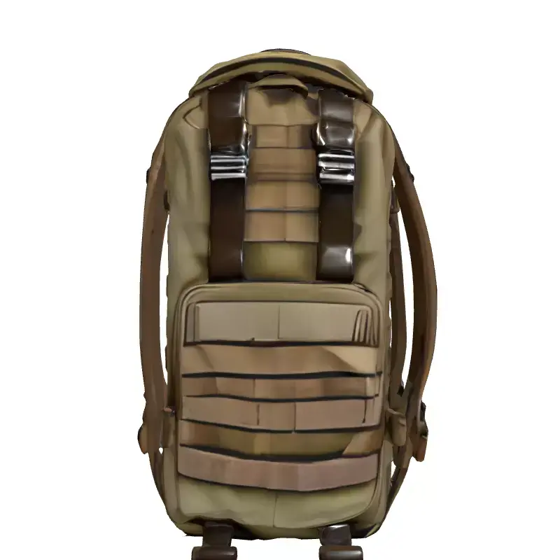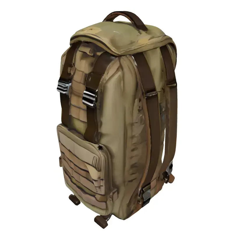 This is a high-quality 3D model of a military-style tactical backpack or rucksack, featuring a distinct camouflage pattern and rugged design. The model is meticulously detailed, capturing the intricate webbing, buckles, straps, and pockets found on real-world combat gear. It is perfectly suited for a wide array of digital applications, including integration into game development projects such as first-person shooters, role-playing games, or survival simulations, where authentic equipment is crucial for immersion. Furthermore, it excels in military training simulations, augmented reality (AR) and virtual reality (VR) environments, and as an essential accessory for 3D character models or digital art compositions. Its clean topology ensures smooth performance in real-time applications, while also being capable of producing high-fidelity renders for static scenes or cinematics. The model is fully UV unwrapped with an optimized layout to facilitate easy texture application and customization. It comes prepared with PBR textures to deliver realistic material properties, enhancing visual accuracy across various rendering engines. Supported file formats include GLB, OBJ, STL, ABC, DAE, FBX, USD, and PLY, ensuring broad compatibility with major 3D software and game engines. This asset is designed for creators seeking a versatile and visually appealing piece of tactical equipment.