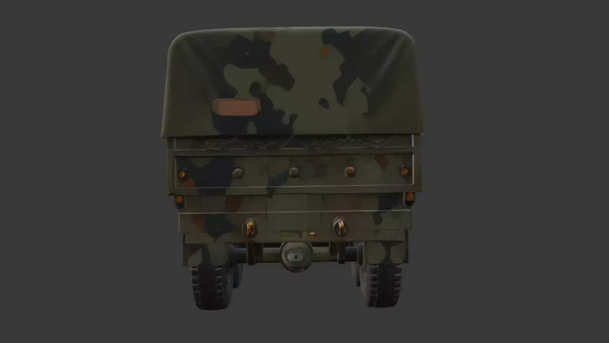 This 3D model depicts a rugged military cargo truck with a camouflage pattern, featuring a covered cargo bed, six-wheel drive, and a sturdy grille with round headlights. Ideal for war simulations, tactical animations, or military-themed projects, it embodies durability and tactical design.