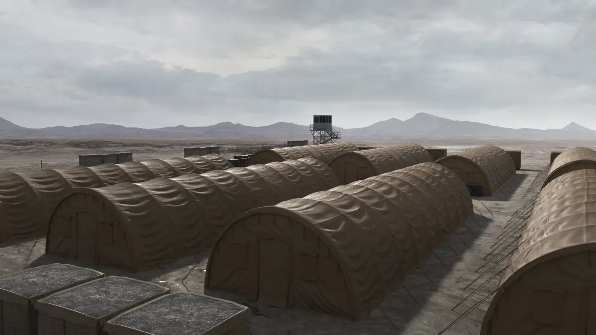 A selection of military camp / base elements that can be arranged, duplicated and composed into various base configurations. The elements contains the following; a watch tower, red cone, tires, barrier, fence, tent, sand bags, sand block, concrete walls, ground plane. Plus maps.