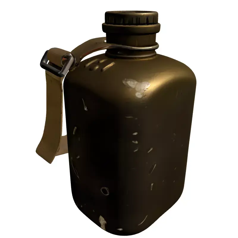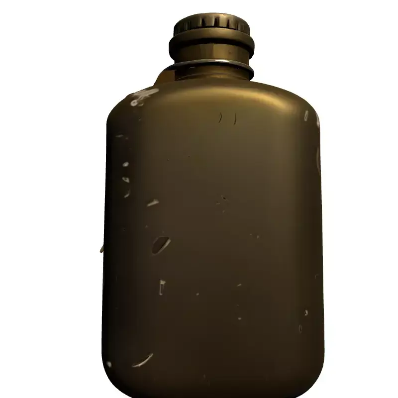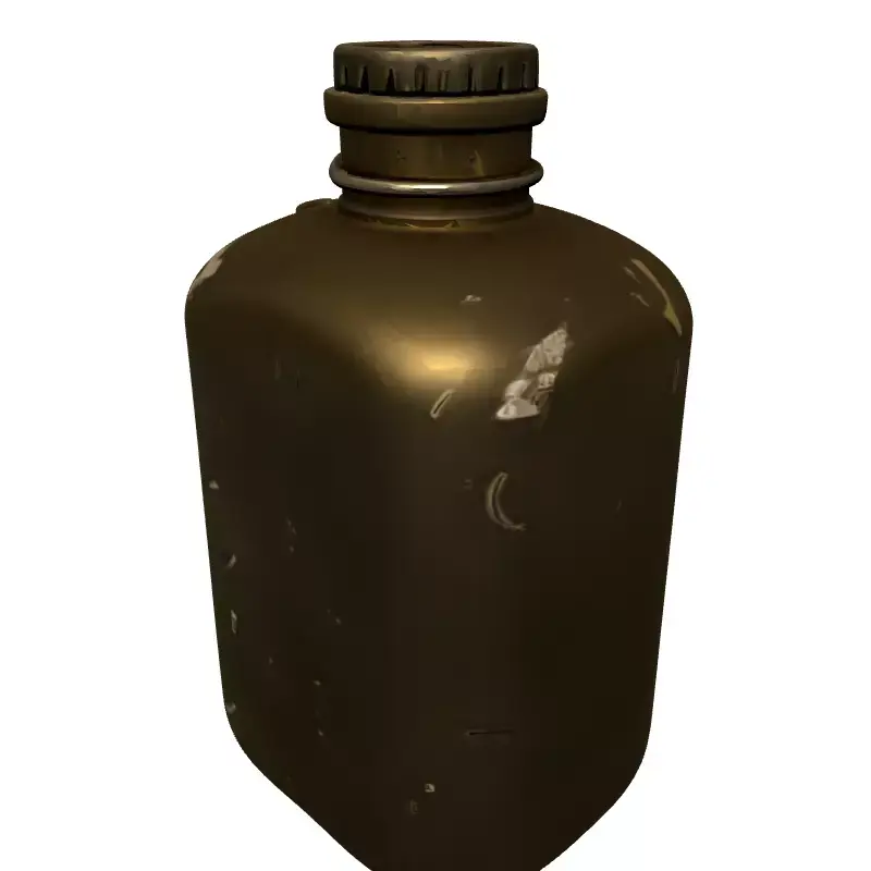 This meticulously crafted 3D model represents a vintage or modern military-style water canteen, featuring a robust olive drab design with realistic wear and tear. The surface exhibits nuanced distressed details, including scratches and paint chips, adding to its authentic, battle-hardened appearance. The model is ideal for integrating into diverse virtual environments, making it perfect for game development, particularly for first-person shooters, survival games, or adventure titles where a touch of realism is crucial. It can also enrich architectural visualization scenes, such as military camps, survival shelters, or rustic outdoor settings, creating a more immersive narrative. Furthermore, this asset is well-suited for creating compelling AR/VR experiences, adding authenticity to digital art projects, or serving as a detailed prop for film and animation. The model is provided in various industry-standard formats, including GLB, OBJ, STL, ABC, DAE, FBX, USD, and PLY, ensuring broad compatibility across different 3D software and game engines. Optimized for real-time applications, its efficient geometry and high-quality PBR (Physically Based Rendering) textures (Albedo, Normal, Roughness, Metallic, AO) ensure excellent performance while retaining visual fidelity. Key features include clean, efficient topology, full UV unwrapping, and a low-poly count that makes it highly performant without sacrificing detail, ensuring it looks great from any angle.