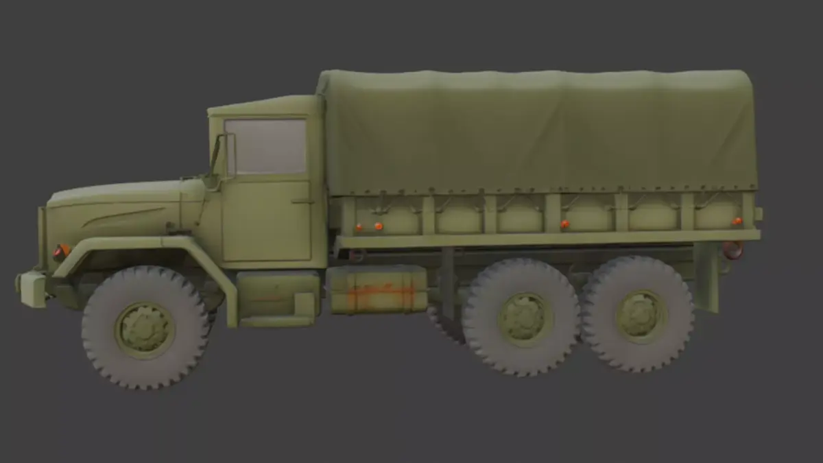 This 3D model represents a classic M35 military cargo truck with a tan canvas-covered bed, six-wheel drive, and a rugged grille with round headlights. Perfect for historical war simulations, tactical animations, or defense logistics projects, it embodies reliability and field-proven design.