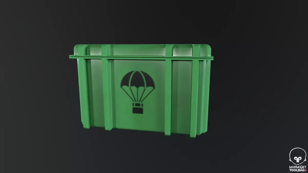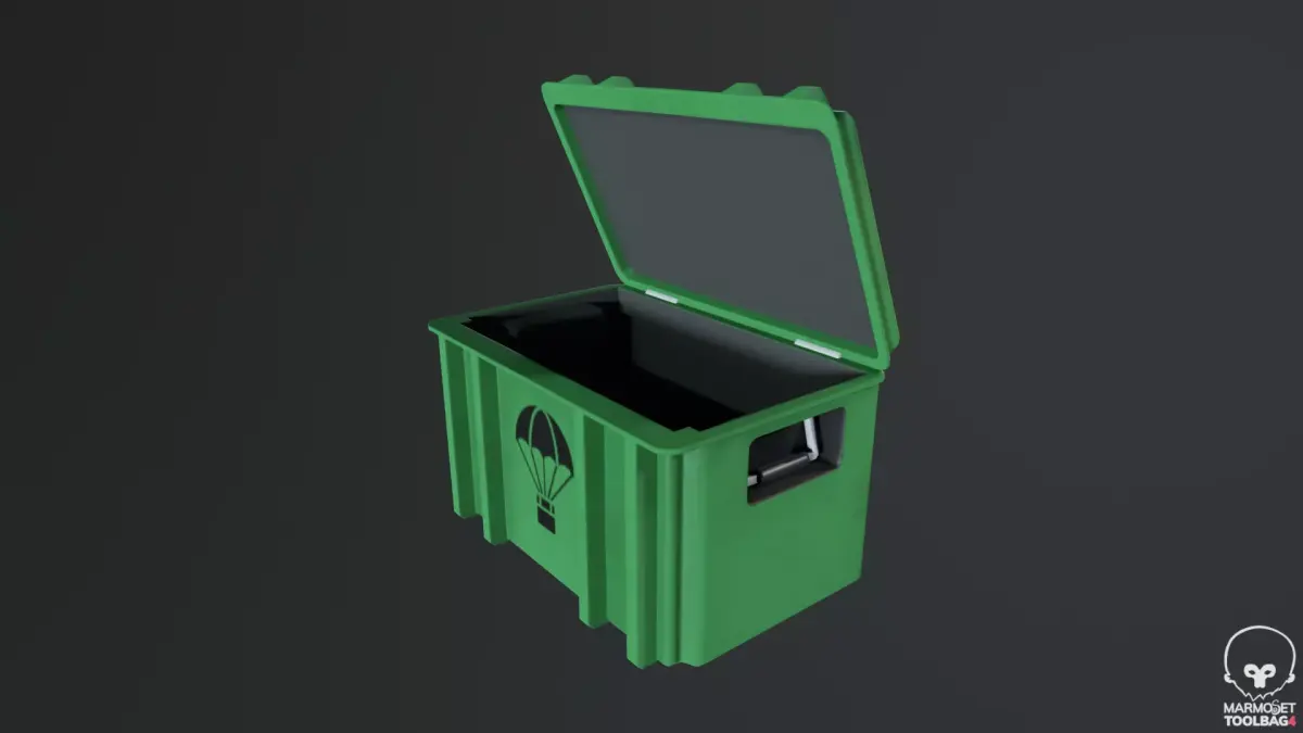 Model of a green military/tactical supply box. There are several options for the position: open lid, closed and partially open. The box has a simple but recognizable shape, a sign with a parachute, which is associated with drop boxes or ammo boxes. Optimized geometry for games, suitable for real time.