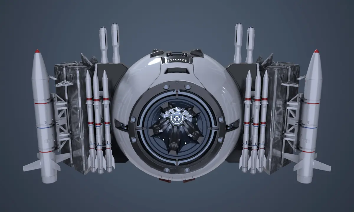 It has 2 big rockets or bombs, 6 medium missiles, and 36 small missliles in 12 launchpods.