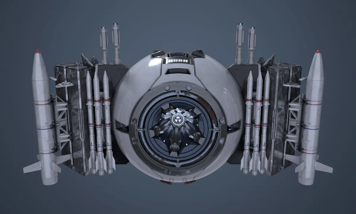 It has 2 big rockets or bombs, 6 medium missiles, and 36 small missliles in 12 launchpods.