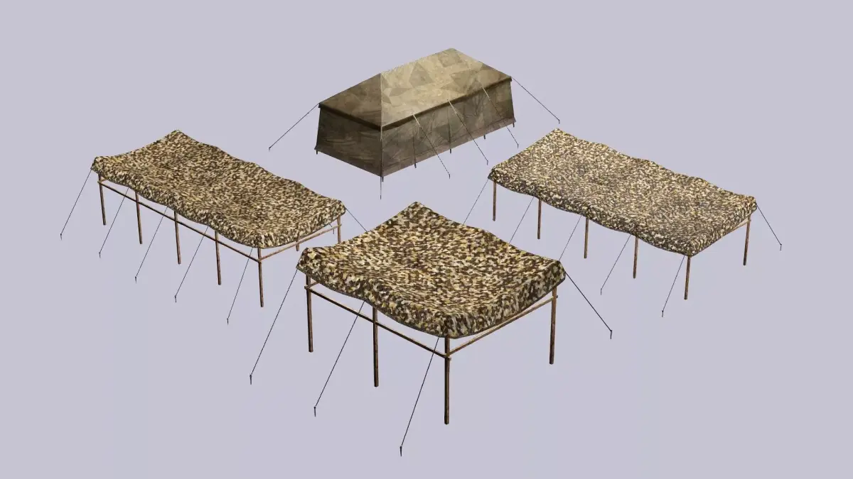 Military Exclusive Blender Tent Set Low Poly 3D Model This is a highly detailed, PBR, AAA, low-poly and game ready model of the camo military tent.This realistic 3D model of the worn army tent is perfect for mmo, action, rpg, strategy games in fantasy, adventure and other medieval genres.It can also be used in movies, TV shows, video clips, cartoons to extend your filming set.The model was created by me in Autodesk Maya 2022, textured and rendered in Substance Painter.