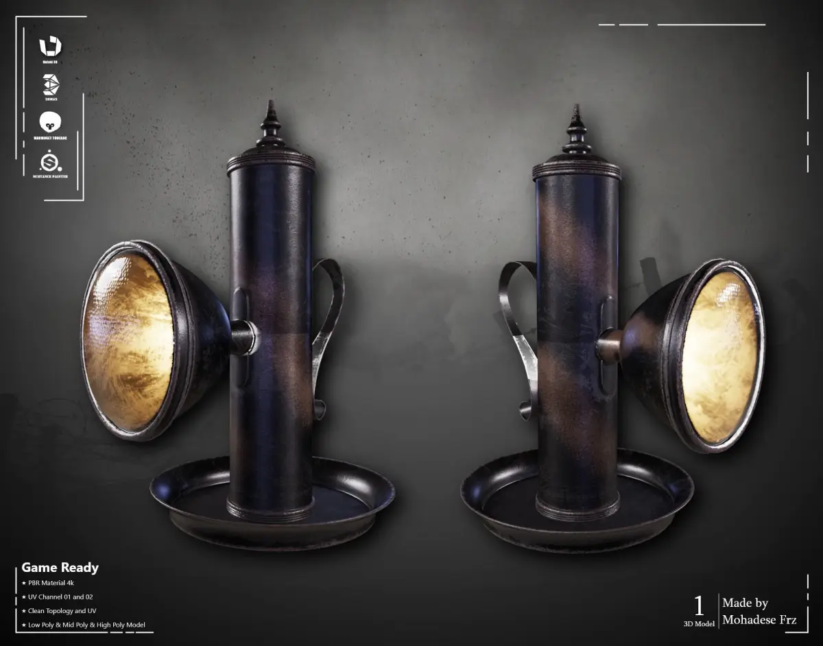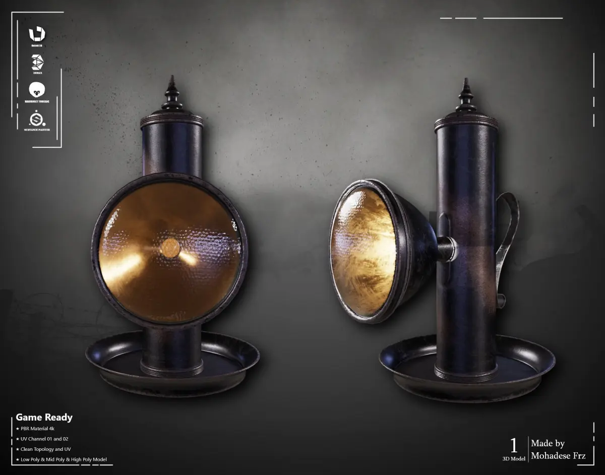 This Flashlight was modeled in 3dsmax software, materialized in Substance Painter software, and rendered in Marmoset Toolbag software.