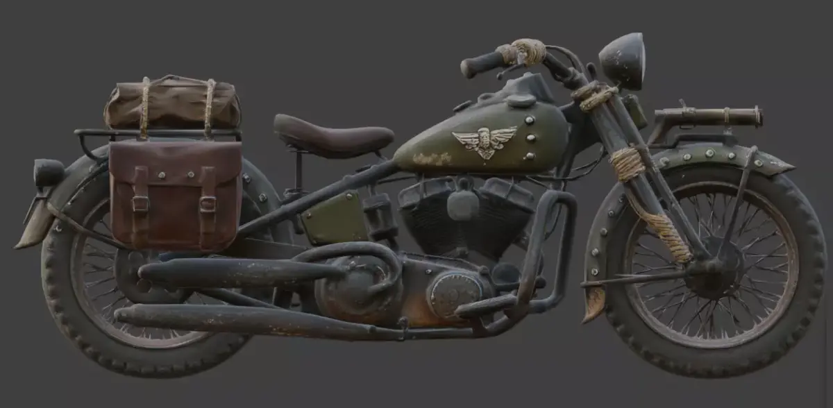 TagsMotorcycleVehicle3DModelMilitaryWildWestCombatFrontierCannonLeatherWeatheredRuggedOliveDrabRopeDesertPBRGameReadyUnityUnrealLowPoly4KRust