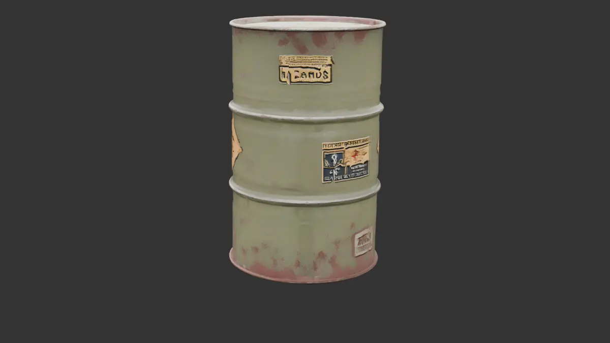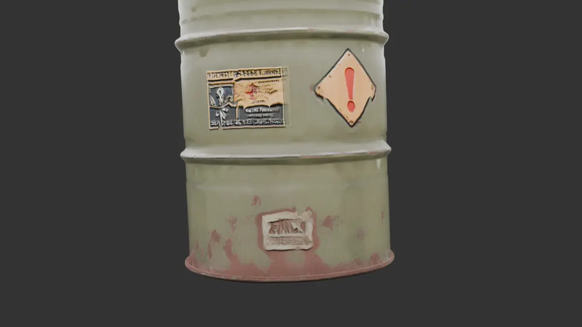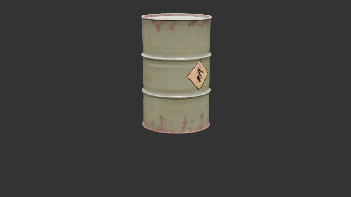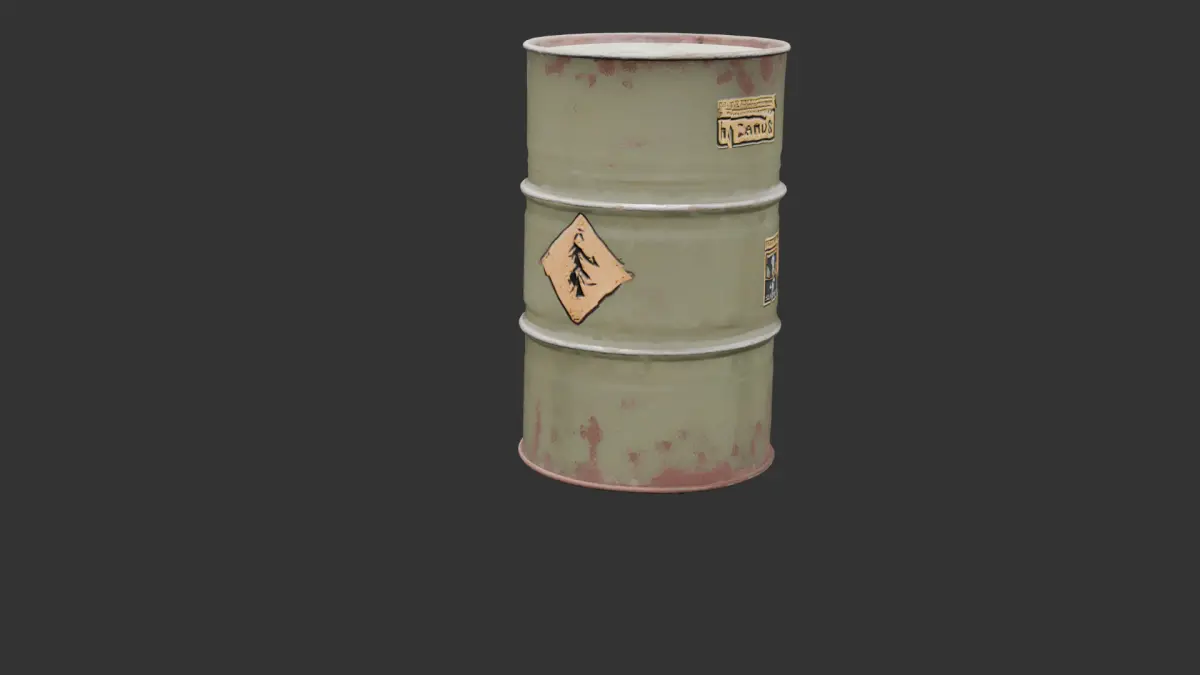 A cylindrical fuel barrel model marked with standard military hazard labels. Great for supply zones or industrial scenes. Textured with metal wear and paint chips.