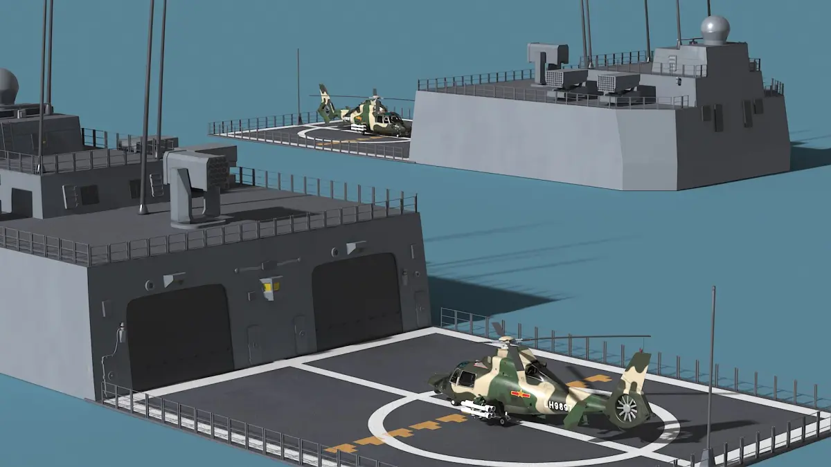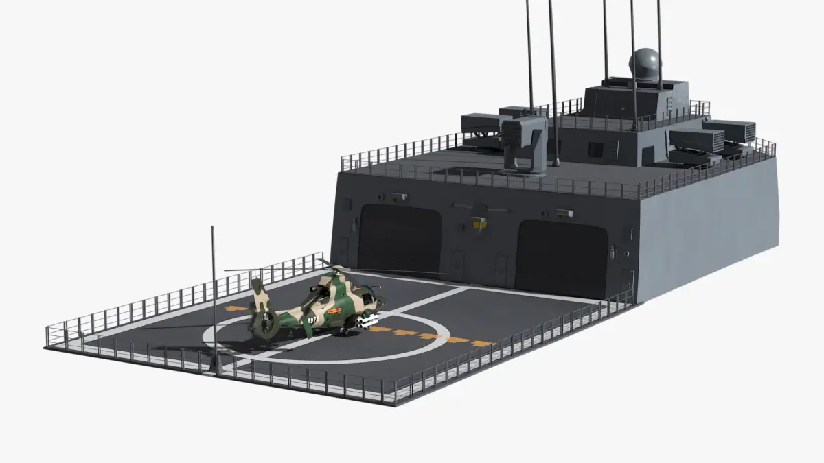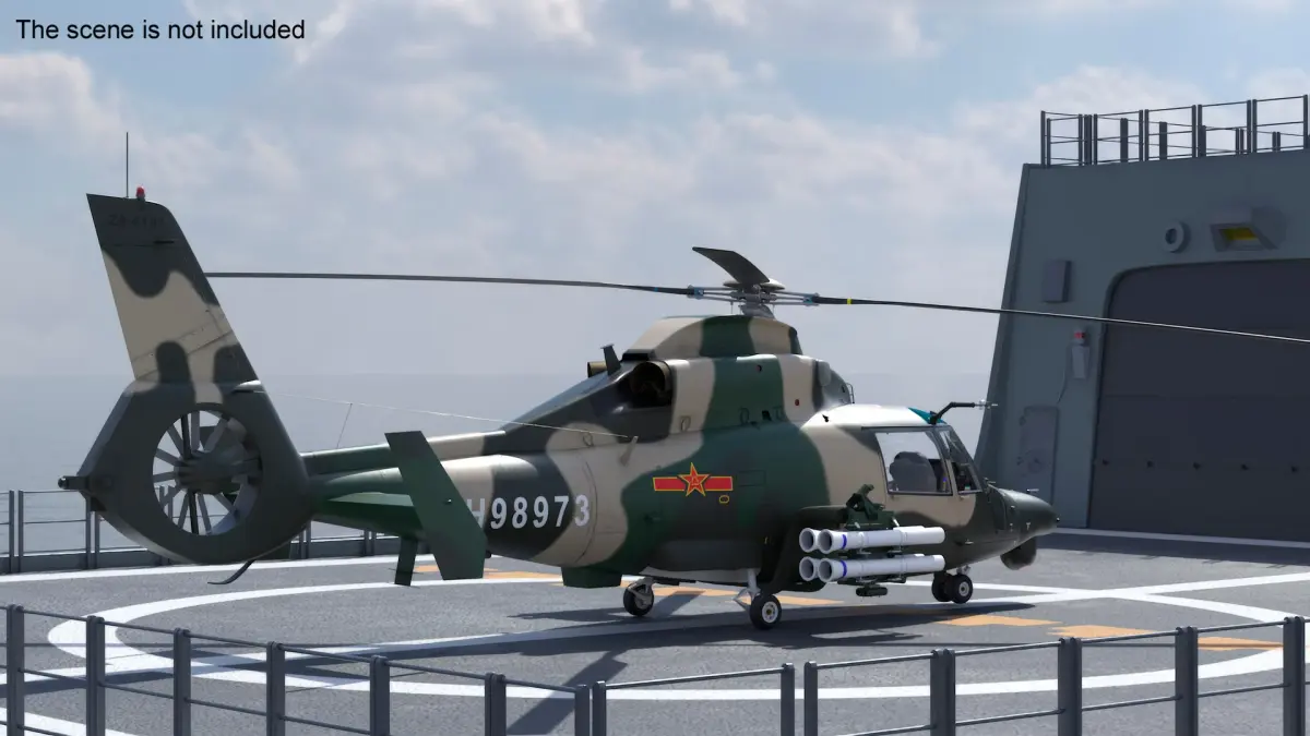 Constructed with attention to detail, the model showcases the robust design of the Z-9WZ helicopter, including its rotor blades, weapon mounts, and naval landing gear. The naval ship deck includes realistic textures, safety markings, and structural elements typically found on modern naval vessels. This model provides high realism, making it suitable for use in military-themed visualizations and simulations, as well as 3D animated sequences that require maritime and aerial authenticity.