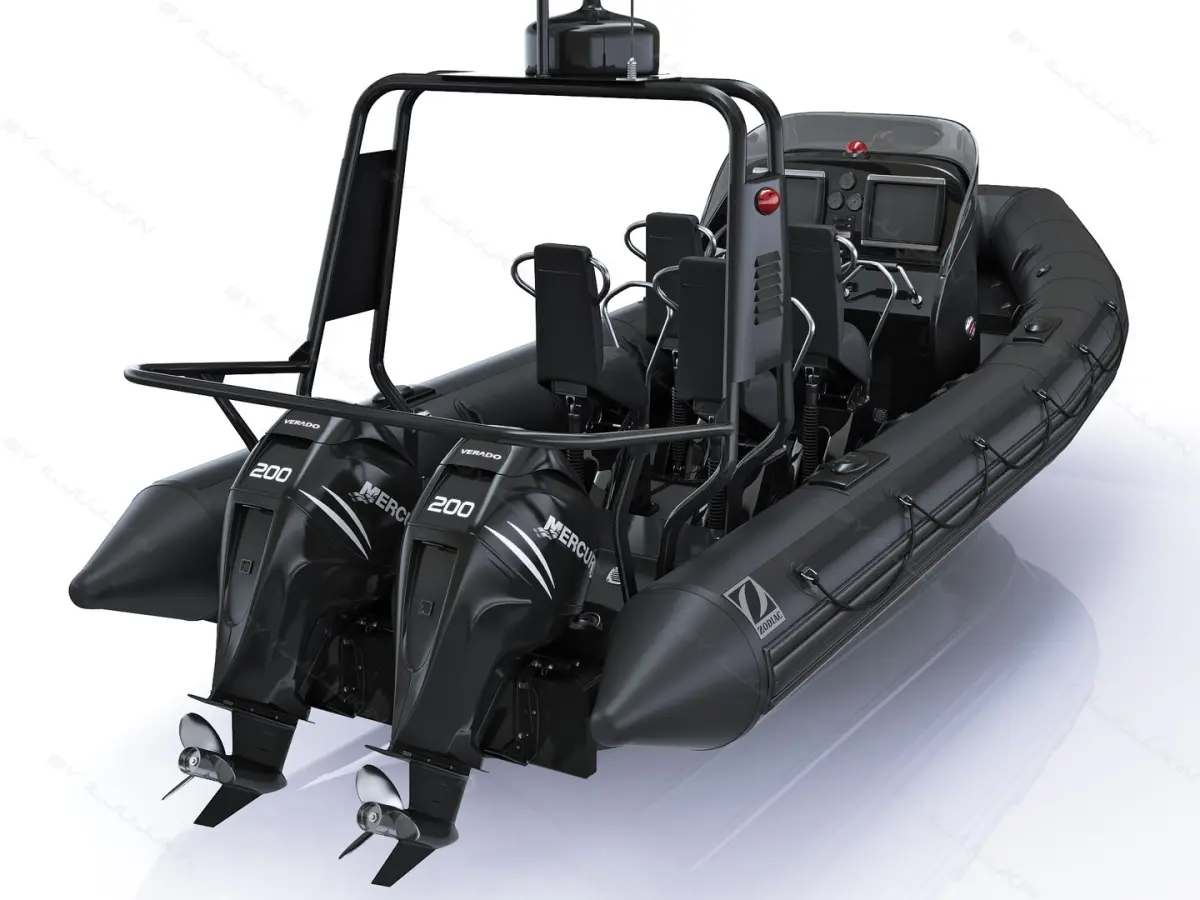 Realistic 3d model of Military inflatable boat Zodiac and engine Mercury Verado 200.