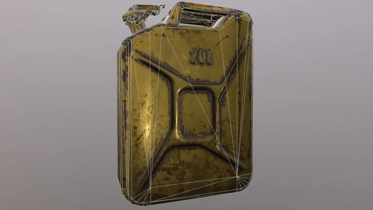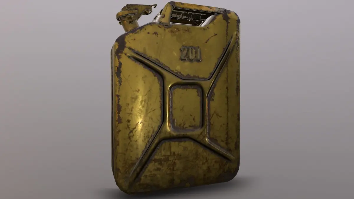 The 3D model of a blue painted oil jerrycan asset. The asset includes 3D variations of Base Color's Texture with 3 differents signs on the jerrycan.