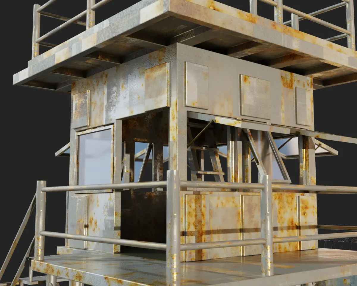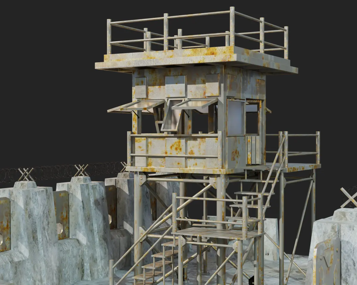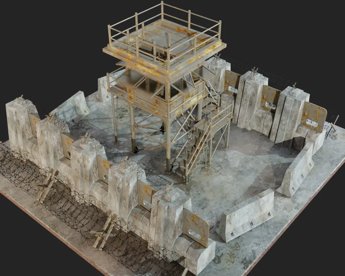 Detailed model of a rusty set of silos. UV unwrapped, with seperate rust maps. Fully customizable. Compatible for every 3d software, game engine. Concrete blocks and emplacements, spiers and razor wires