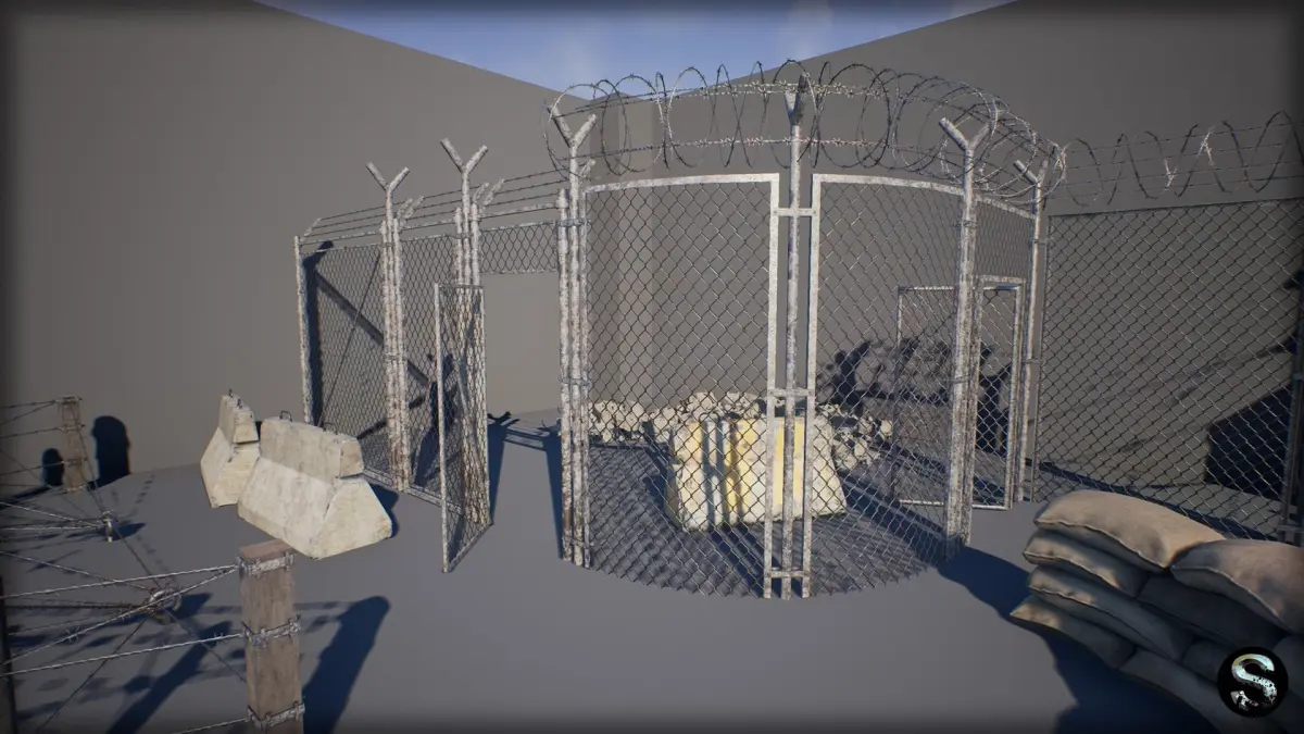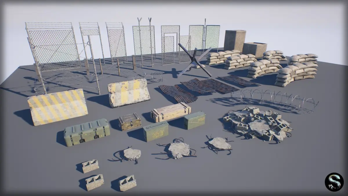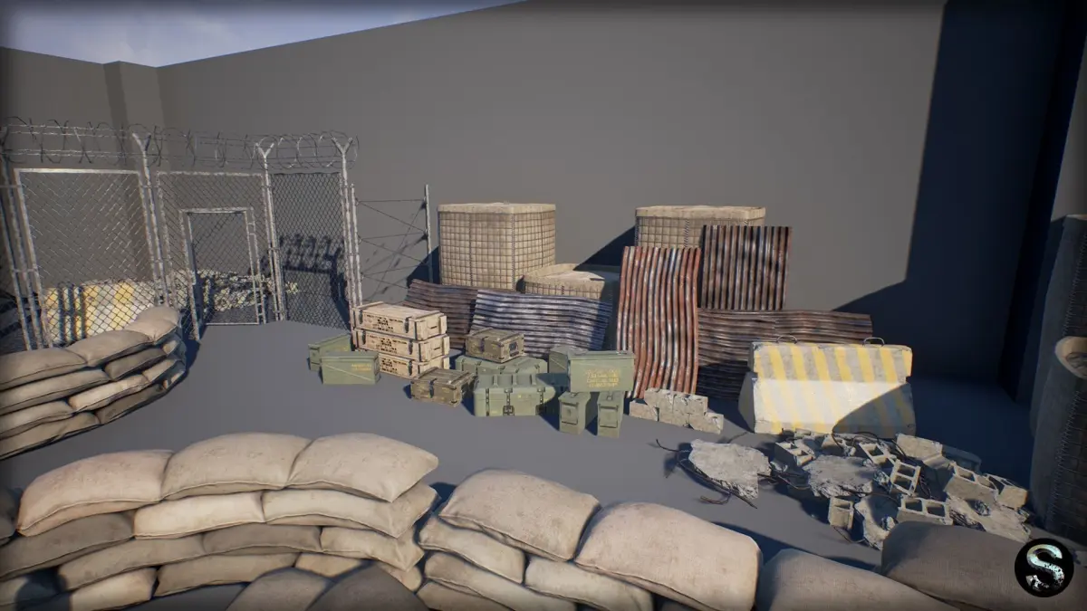 This props package intended for the development of military games. It includes high-quality models of fences, sandbags, ammobox, concrete debris, etc.