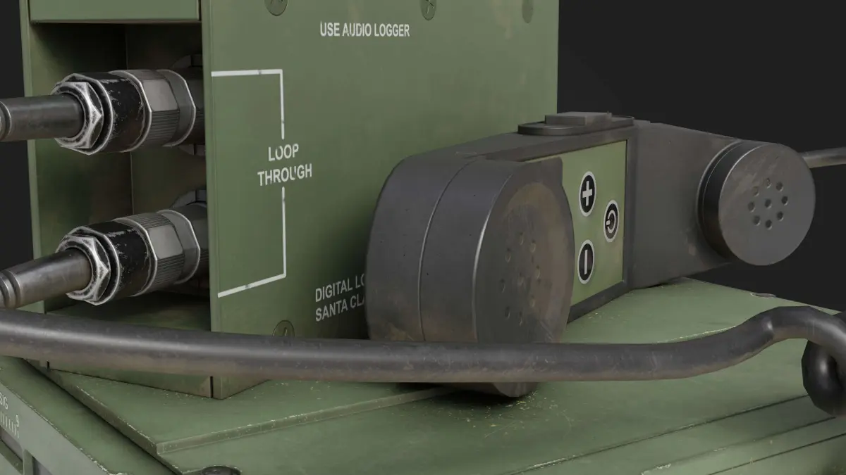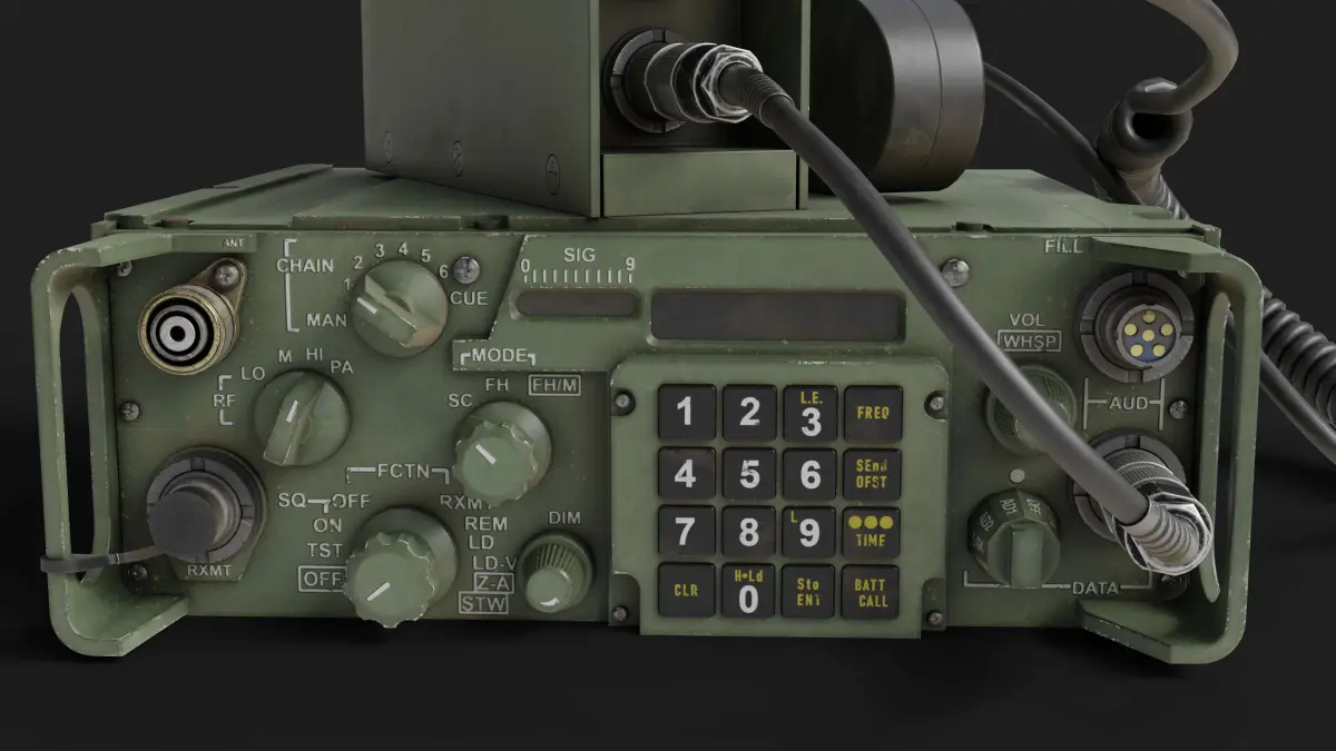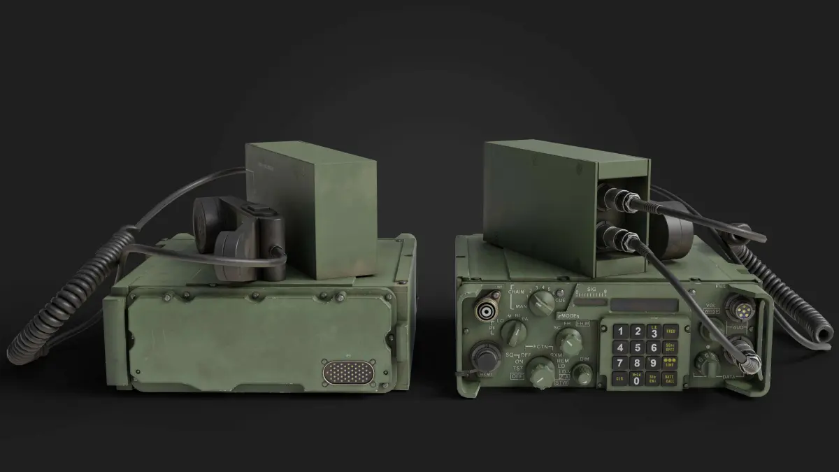 This is a realistic, high-quality 3D model of a military-grade tactical radio, built for use in games, cinematics, or virtual simulations. It includes intricate mechanical details, coiled wiring, and authentic labeling for maximum realism.