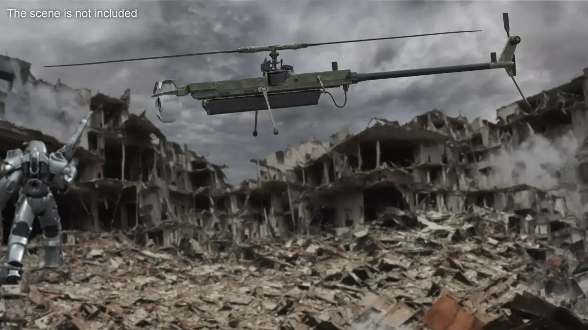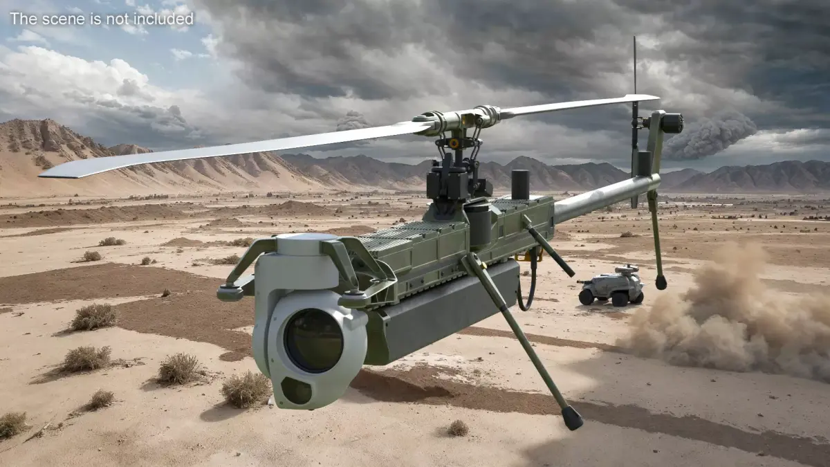 The model showcases a compact design equipped with state-of-the-art optics and sensors, enabling high-resolution imaging and data collection. Its rotorcraft structure allows for vertical takeoff and landing, increasing versatility in various terrains. The UAV's stealthy build and advanced materials ensure it can operate efficiently while maintaining low visibility.