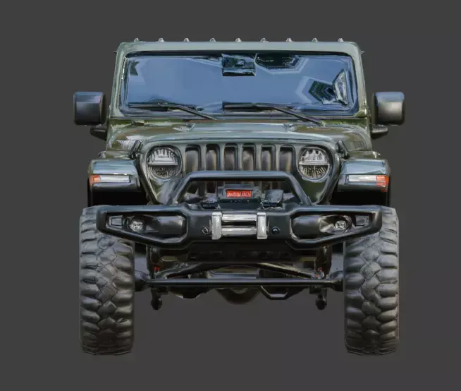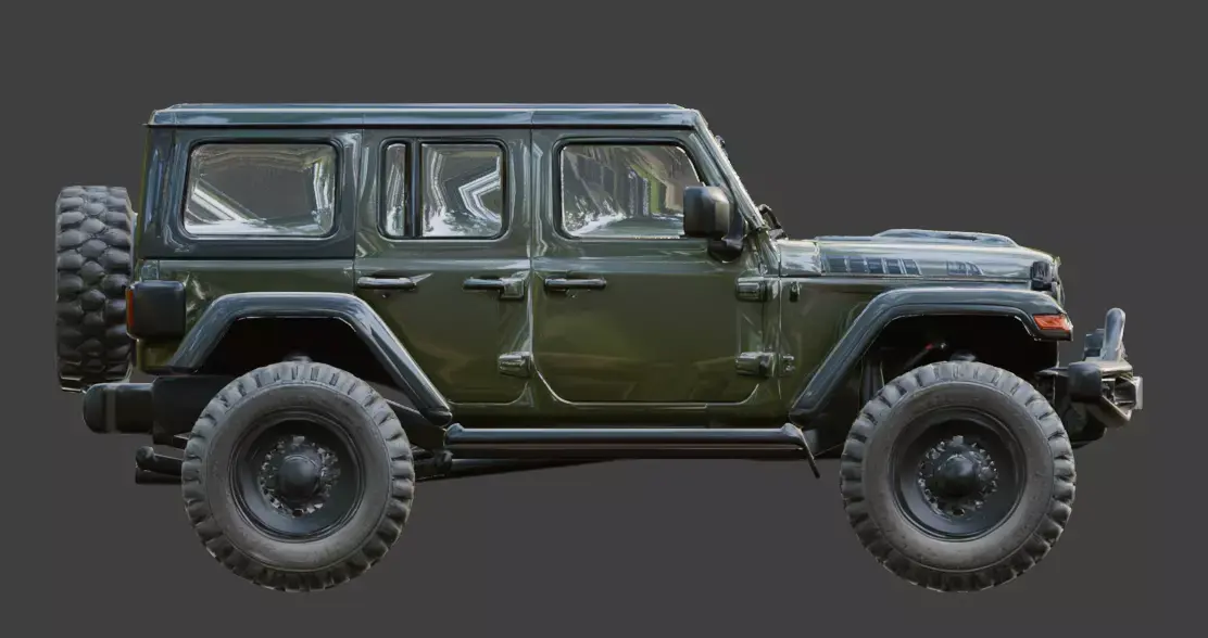 This 3D model features a rugged, military-inspired 4-door off-road vehicle designed for extreme environments and tactical operations. The asset is finished in a professional matte olive drab paint with blacked-out trim, giving it a stealthy and utilitarian aesthetic. Key functional upgrades include an oversized heavy-duty front bumper equipped with a detailed recovery winch and integrated LED light bar. The vehicle sits on an elevated suspension system paired with massive, deep-tread mud tires designed for superior traction. This model is perfect for military simulations, survival-themed games, or high-end cinematic renders requiring a powerful, battle-ready vehicle.