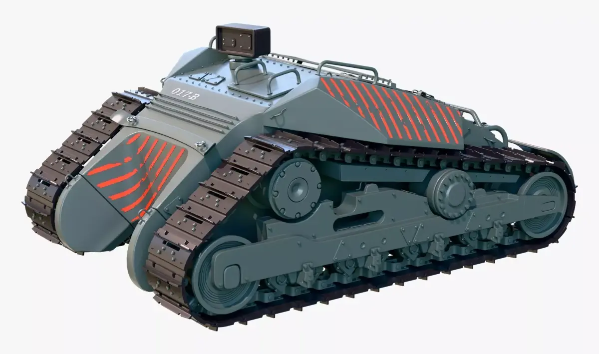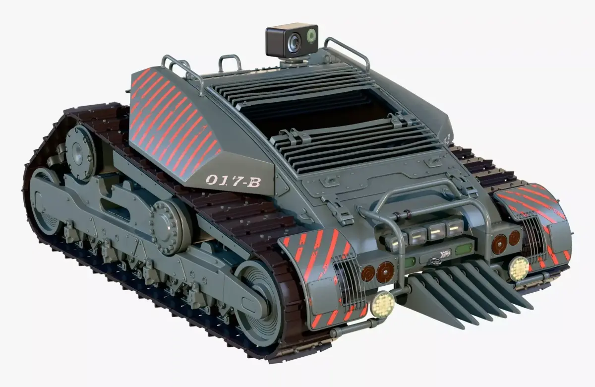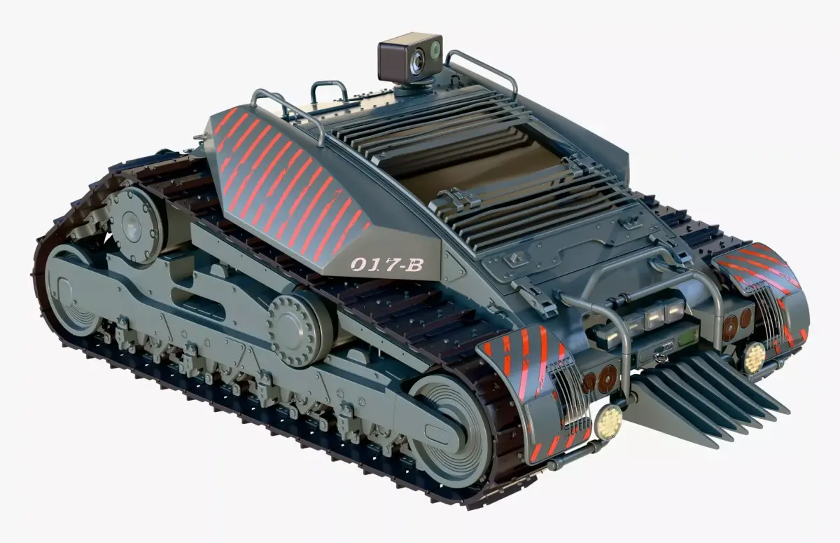 Hybrid tactical sapper featuring both manned and autonomous modes. The design is defined by an aggressive wedge-shaped silhouette and strict utilitarian armor geometry.
