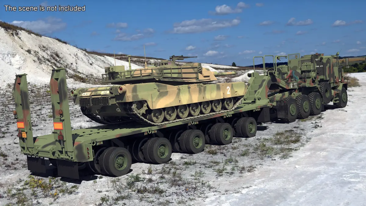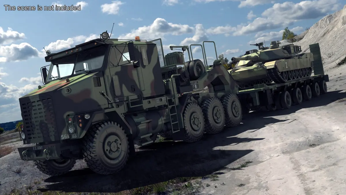 Military Tank Transport Truck Oshkosh M1070 with M1 Abrams is a 3d model of a military transport vehicle designed for carrying heavy equipment, such as tanks and other armored vehicles.