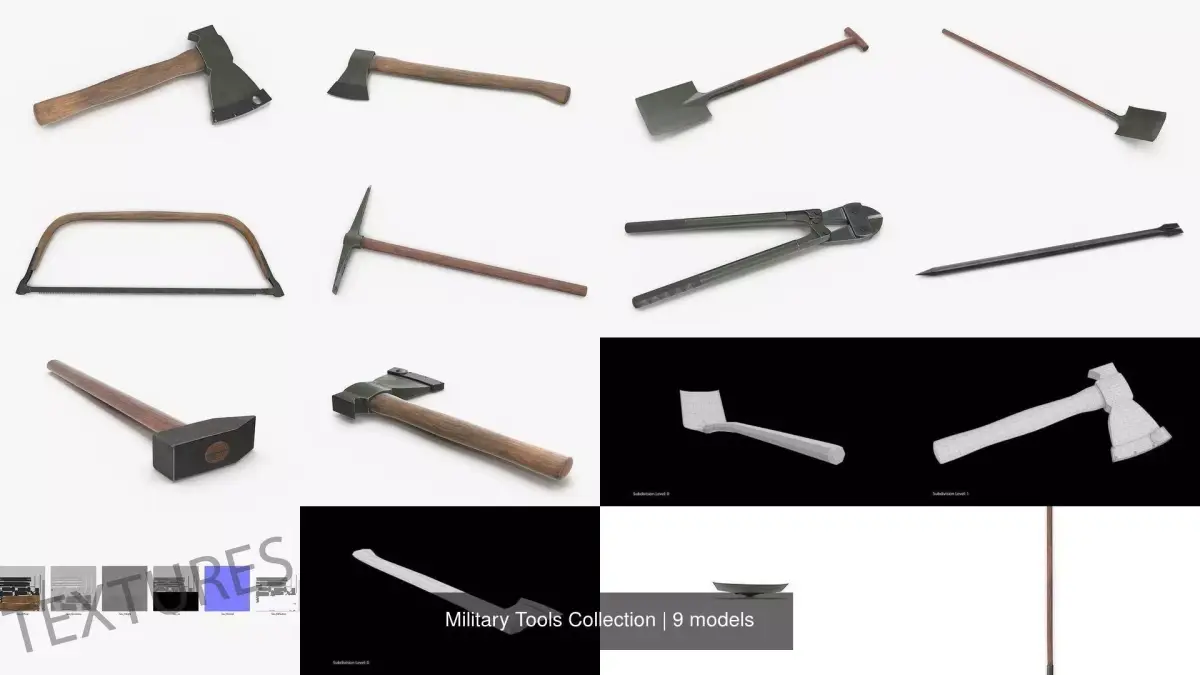 This Military Tools Collection is a high quality, photo real collection that will enhance detail and realism to any of your rendering projects. The models has a fully textured, detailed design that allows for close-up renders, and was originally modeled in 3ds Max 2014 and rendered with V-Ray. Signature image scene doesn''t included. All models in this collection lays in separate scenes