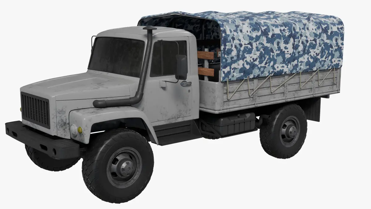 This 3D model represents the GAZ Sadko 3308, a rugged 4x4 utility truck commonly used by military and emergency services. Designed for tough off-road conditions, it’s ideal for transporting personnel and cargo across challenging terrain. The model features realistic details such as a camouflaged canvas cover and weathered surfaces, making it a great fit for military simulations, games, and visual projects.